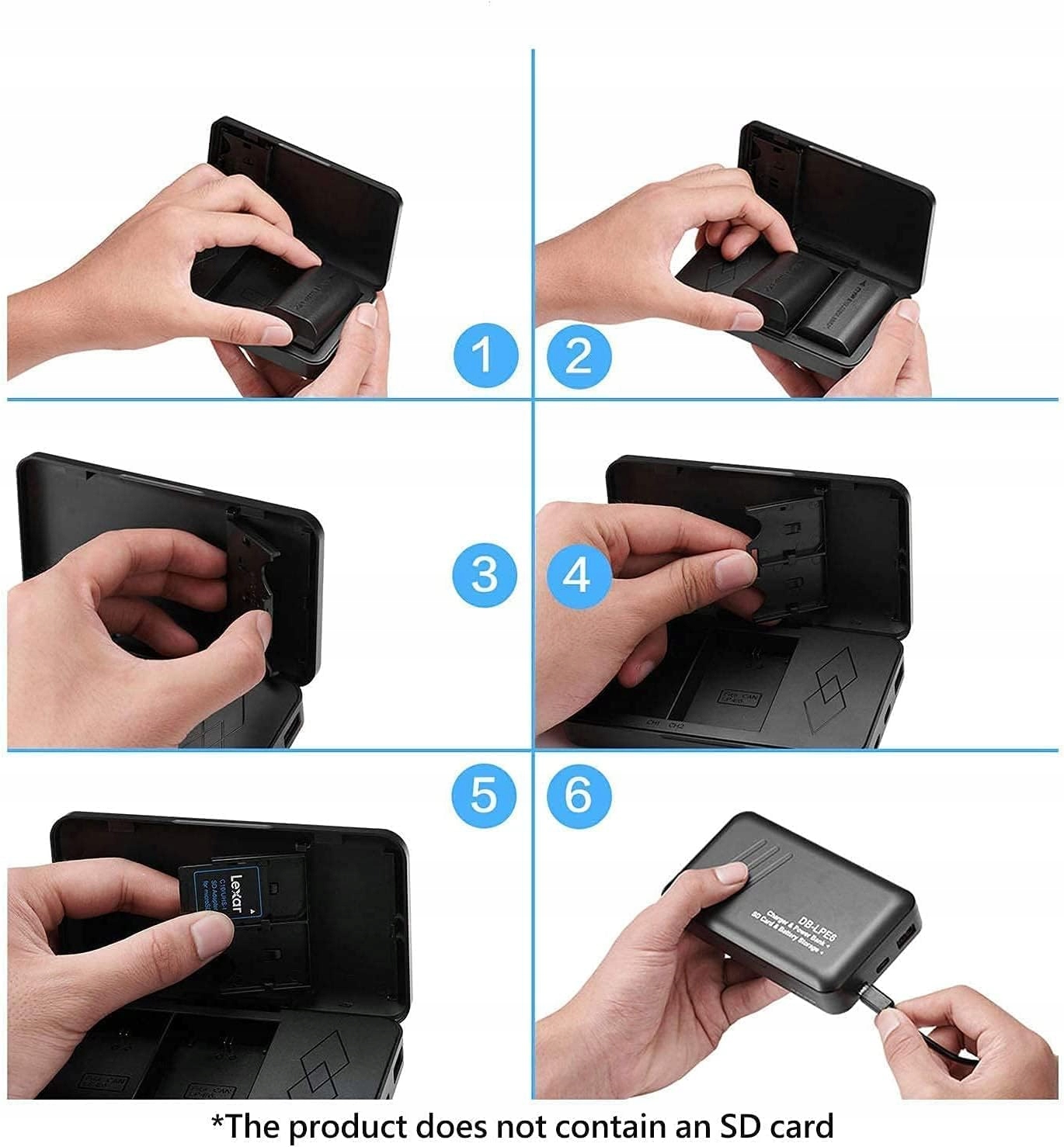 - Зарядний пристрій 4 в 1: багатофункціональний зарядний пристрій для заряджання 2 акумуляторів. Унікальний дизайн з USB-виходом 5 В, може працювати як павербанк, коли батареї всередині. Зверніть увагу на те, що на карті пам’яті потрібно 2 карти SD. Повністю задовольняє ваші потреби в електроенергії та пам’яті.