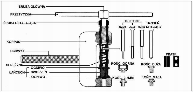 - Схема монтажу пристрою наведена на схемі нижче. Штифт 2,2 мм в основному використовується для ланцюгів ГРМ. Штифт 2,9 мм призначений для ланцюгів розміром 25 або 35, а штифт 3,8 мм — для ланцюгів приводу мотоциклів розміром 428 - 530 і 630.