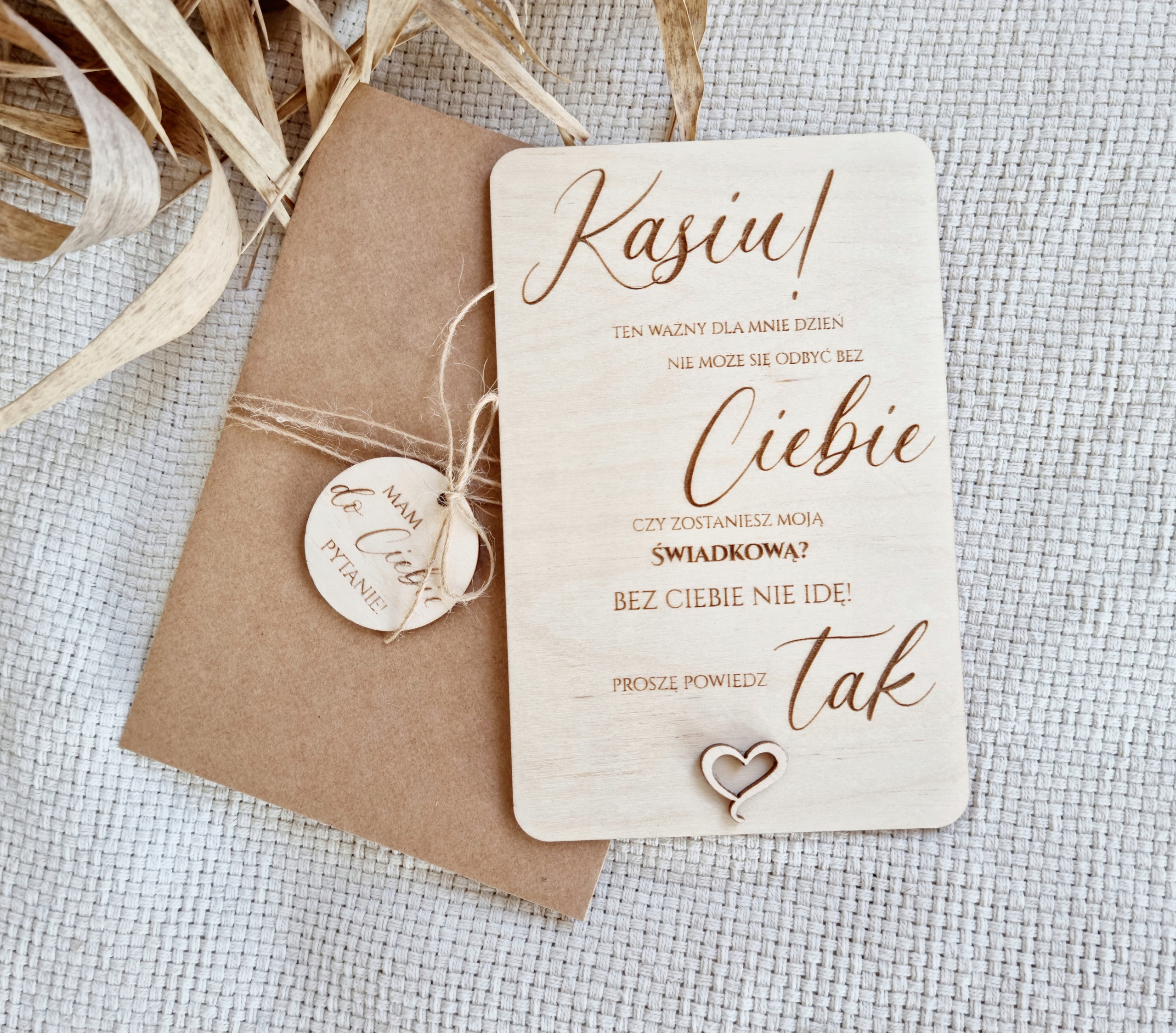 До листівки додається крафтовий конверт з дерев'яним елементом з написом "У мене до Вас запитання!" підвішений на джутовій нитці.