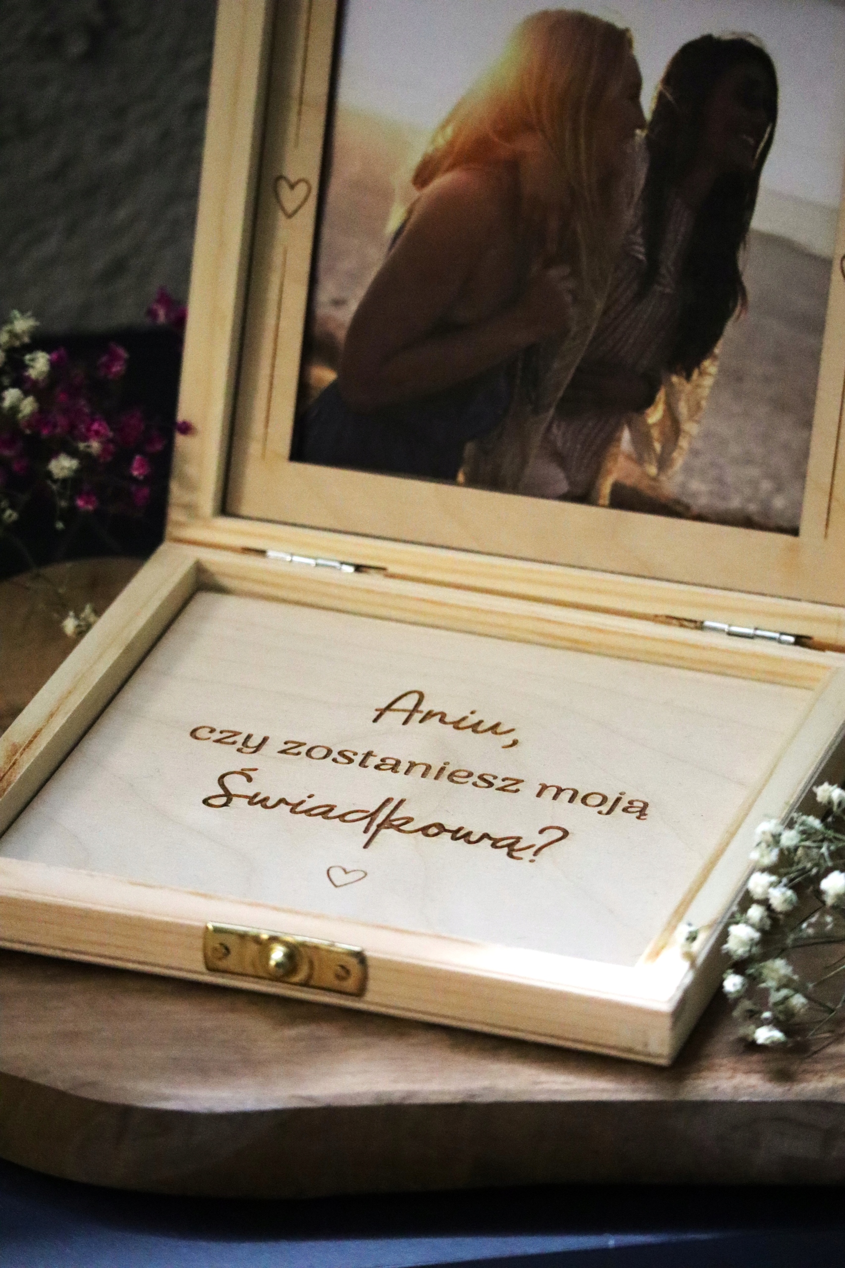 дерев’яна коробка з місцем для вашої фотографії як оригінальної ідеї просити свідчення! Фото, з прекрасною гравюром, яка, безумовно, радує свою оригінальність та увагу до деталей! Клейка або подвійна стрічка. Один шматок - якщо вам потрібен запит для обох свідків - купуйте два штуки.