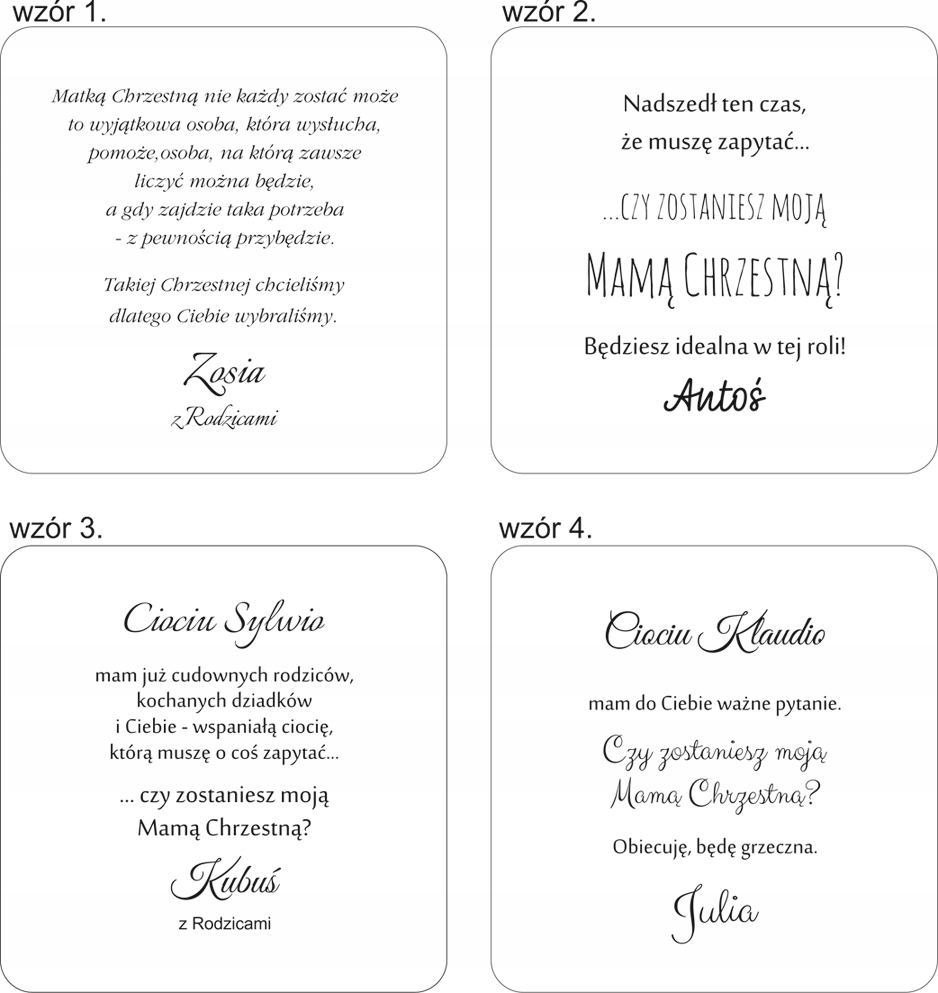 Ми пропонуємо 4 тексти посеред підписки. Кожна схема може бути для хрещеної матері та хрещеного батька:
