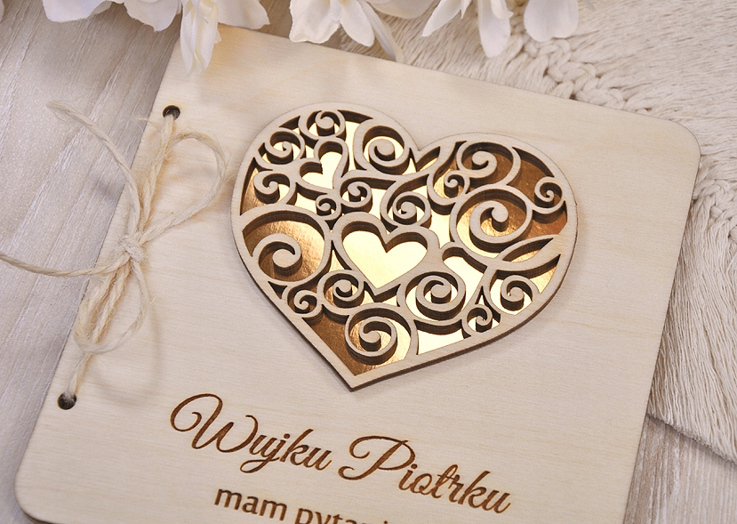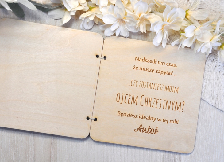 Ми пропонуємо вам дуже приємні та елегантні проходи з питанням для хрещеної матері чи хрещеного батька. Це дуже оригінальний спосіб запитати, запитати когось, чи хоче він стати хрещеною батьком чи хрещеним батьком нашої дитини. Верхня частина прикрашена дерев’яною, прикрасою з відкритим робіт із золотим дном (що дає прекрасний ефект "3D"). Нижня частина виготовлена з дерева, з гравірованим вмістом - серце корпусу;) обидві частини підписки пов'язані між собою з декоративною струною.