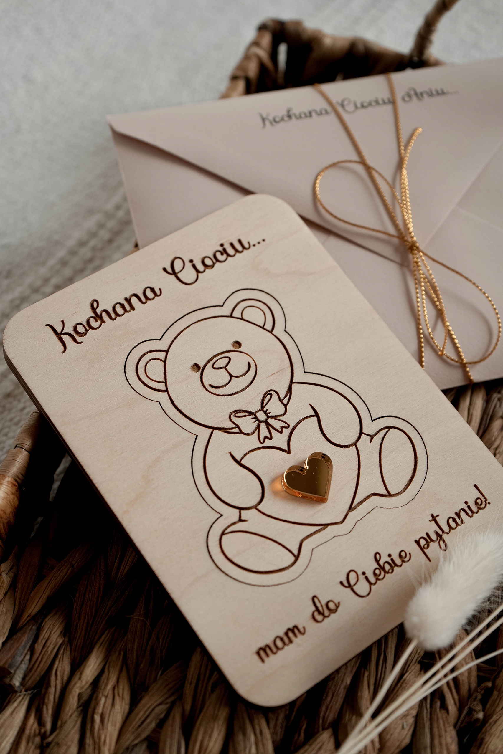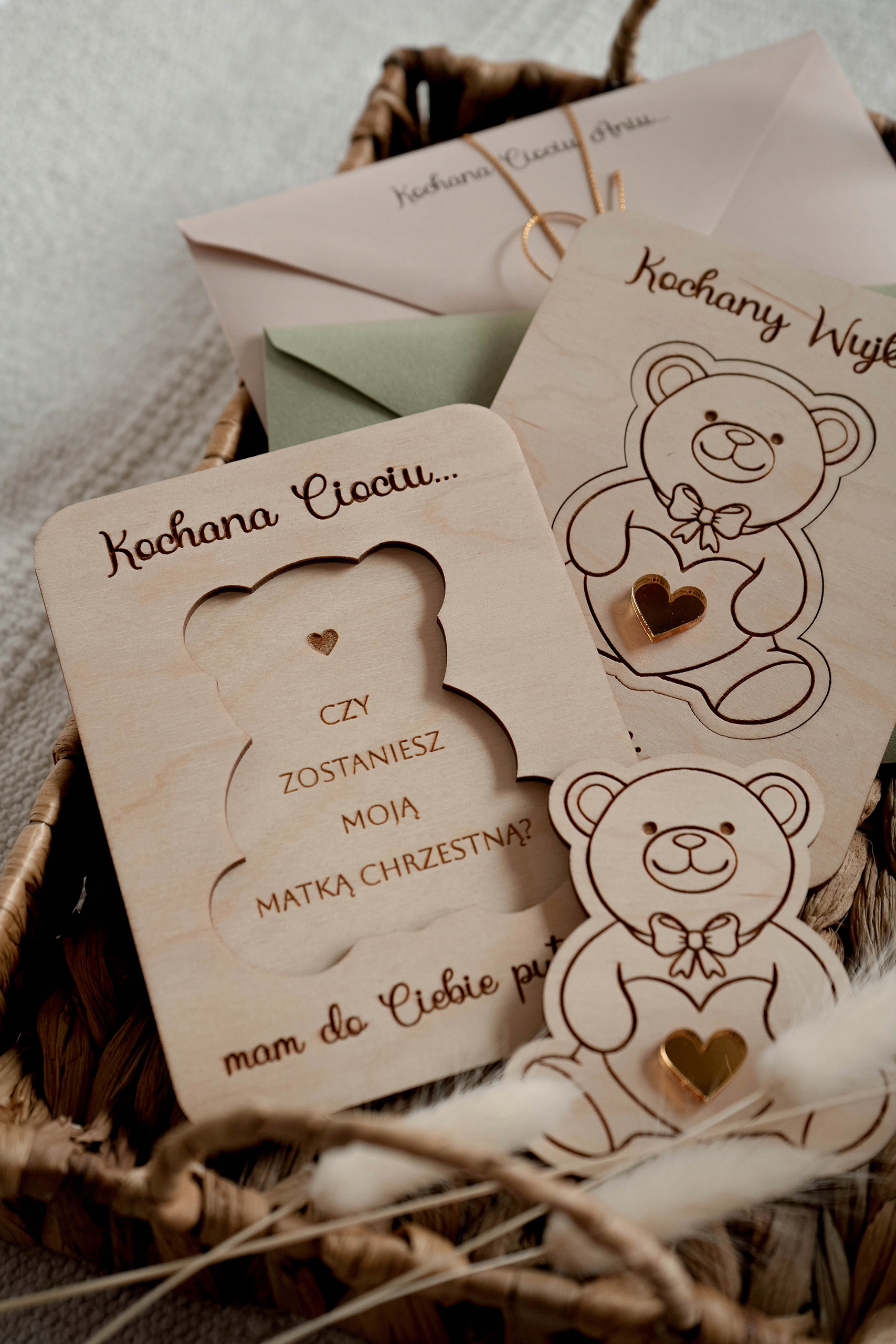 Унікальні побажання для майбутніх Хрещених від малюка. Запити мають вигравірувані написи та знімні плюшеві ведмедики з опуклими золотистими дзеркальними сердечками, під якими ховаються запитання: «Чи станеш ти моєю хрещеною мамою/хрещеним батьком?»