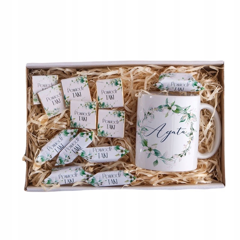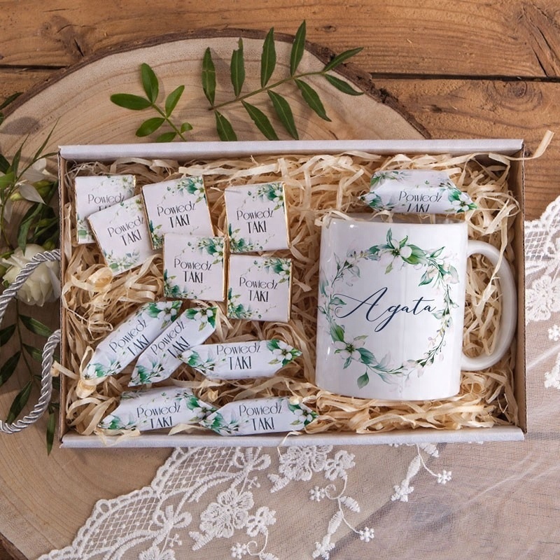 Прохання стати фрейліною в елегантній білій коробці з кришкою, персоналізованою карткою із запитанням для одержувача. Всередині на натуральній деревній вовні кухоль з ім'ям майбутнього власника, помадка і смачні шоколадні цукерки, упаковані в папірці з написом "Скажи ТАК!" Чудовий подарунковий набір неодмінно зачарує майбутніх наречених.