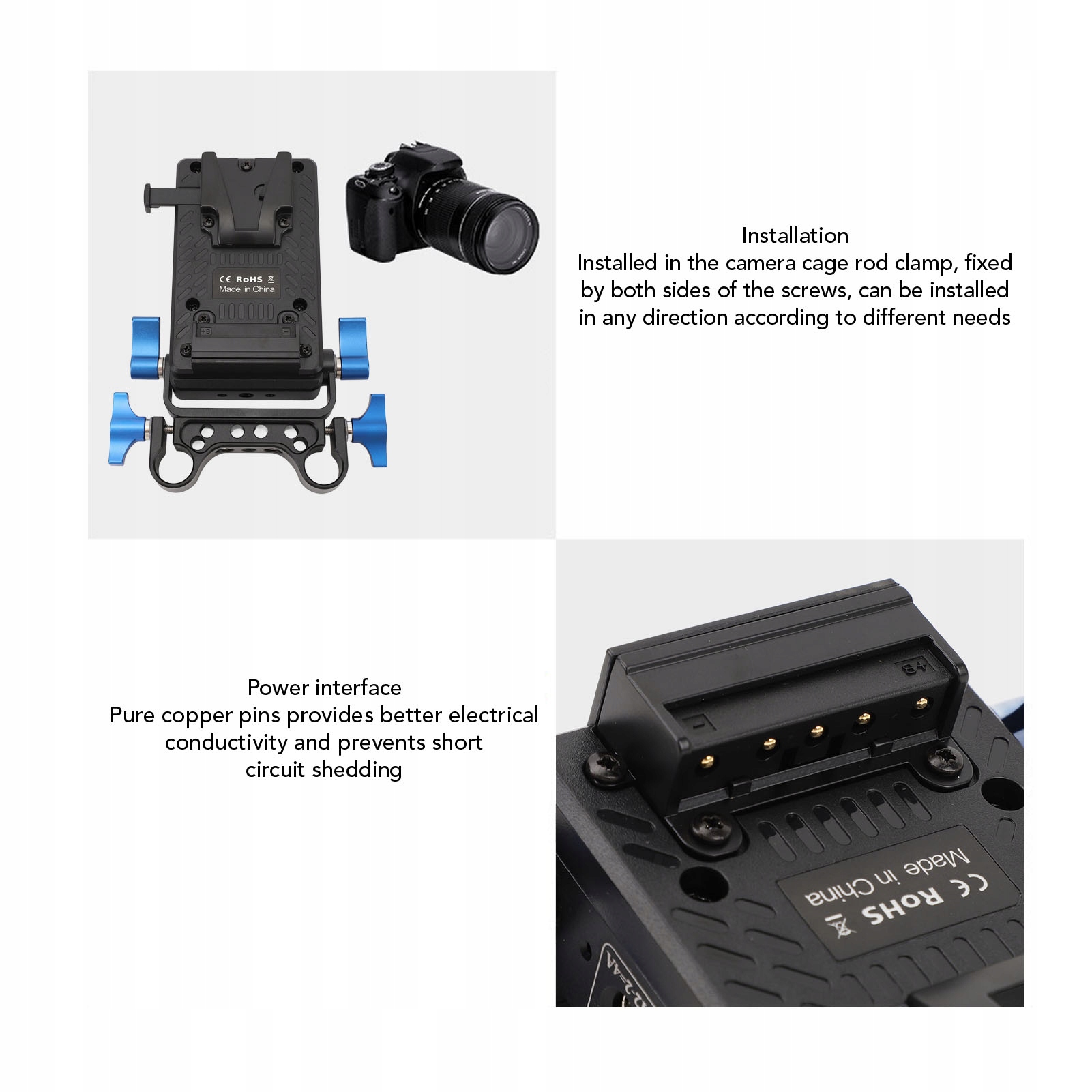 2. Легка установка: Адаптер акумулятора з кріпленням V встановлюється на затискач клітини камери та кріпиться гвинтами з обох боків. Його можна встановити в будь -якому напрямку, залежно від різних потреб.