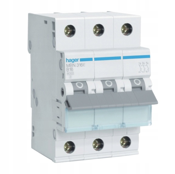 Призначений для захисту установок в житлових будинках і громадських установах. Захищає схеми та приймачі в електроустановках від перевантажень і коротких замикань. Триполюсний вимикач, номінальний струм 16A з характеристикою B.