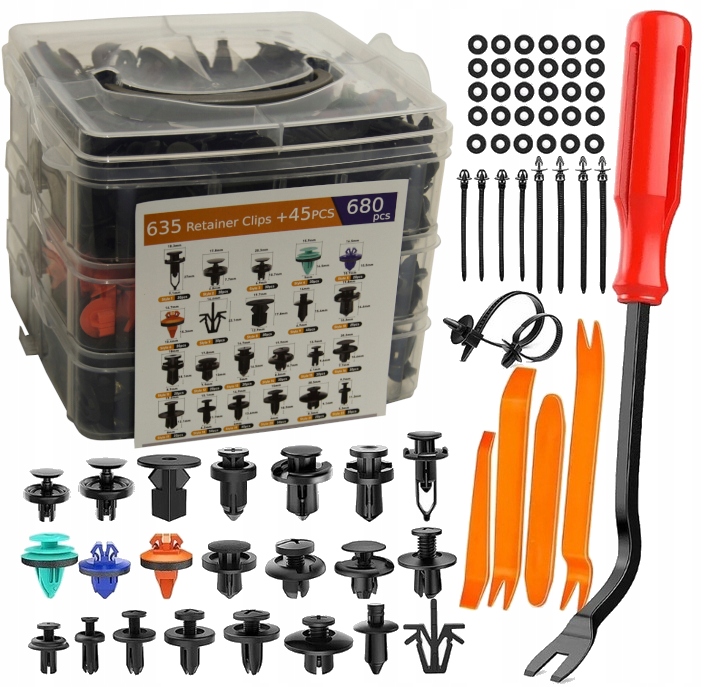 Набір із 680 частин різних типів розширювальних штифтів, затискачів, стрічок, шайб разом із основними інструментами для їх видалення та виймання пластику.
