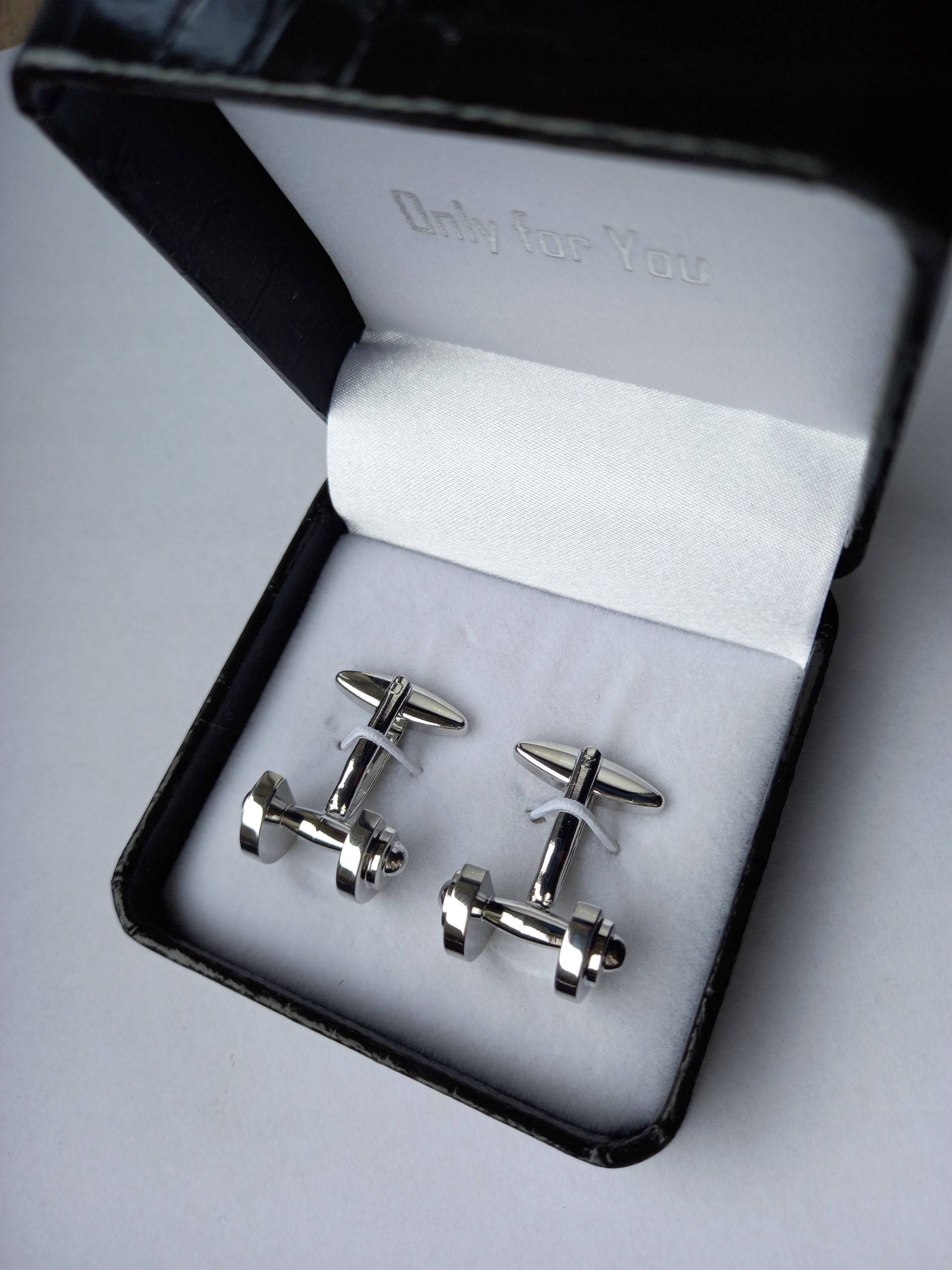 Срібні сорочкові запонки у вигляді штанги, гантелі як показано на фото. Запонки виготовлені з дорогоцінного металу та упаковані в ексклюзивний футляр Exciting із візерунком зі зміїної шкіри та срібними написами.