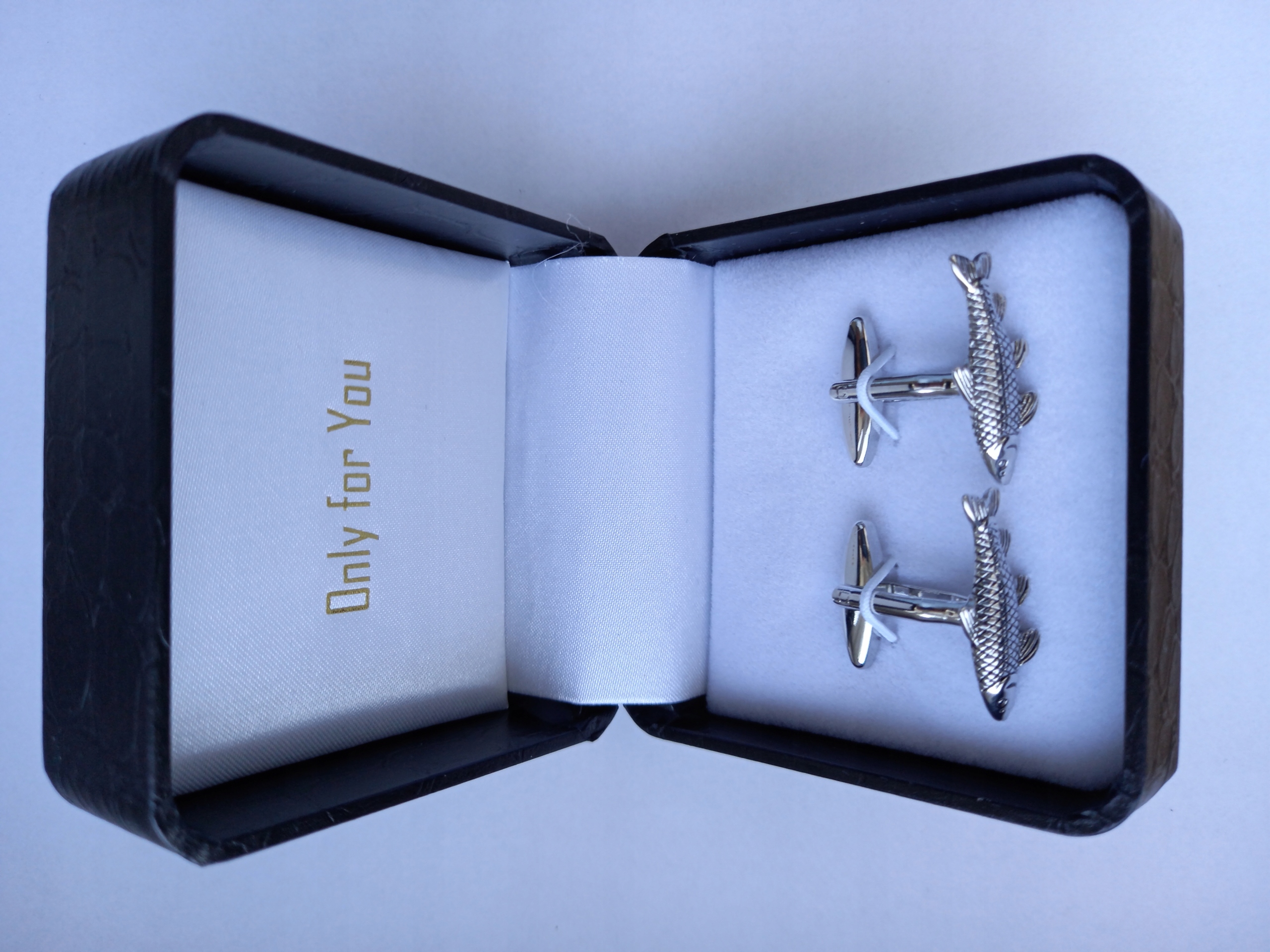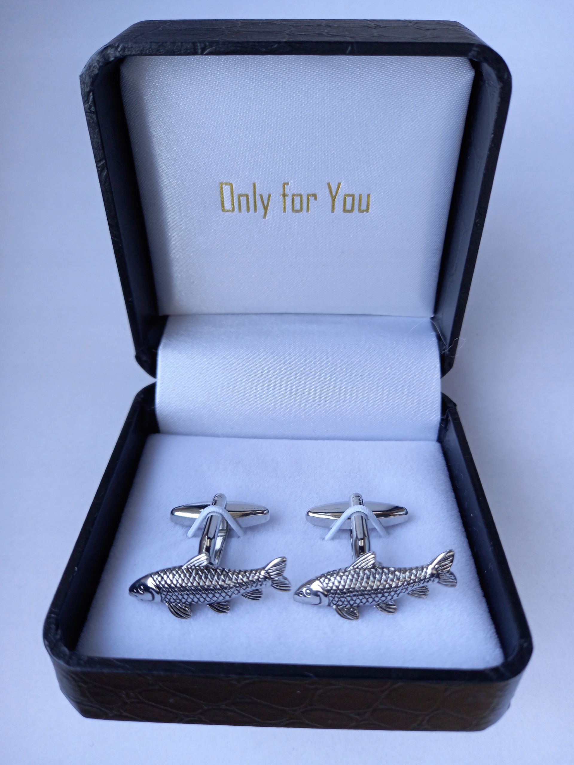 Гарні сріблясті запонки для сорочки від Exciting у формі рибки. Запонки упаковані в ексклюзивну чорну коробку Exciting з малюнком зміїної шкіри зовні та атласною тканиною всередині. Дуже цікаві запонки, підійдуть на подарунок.