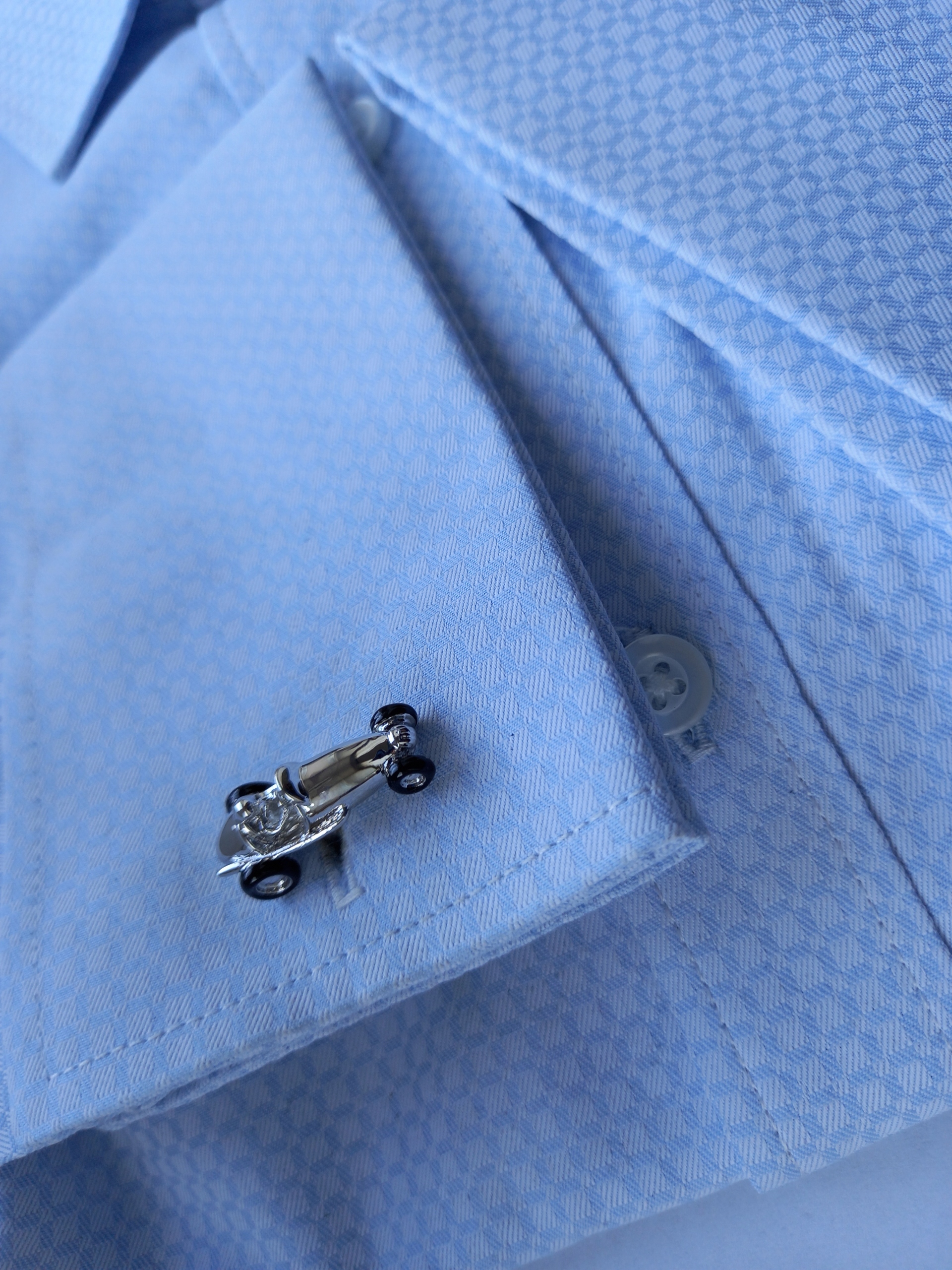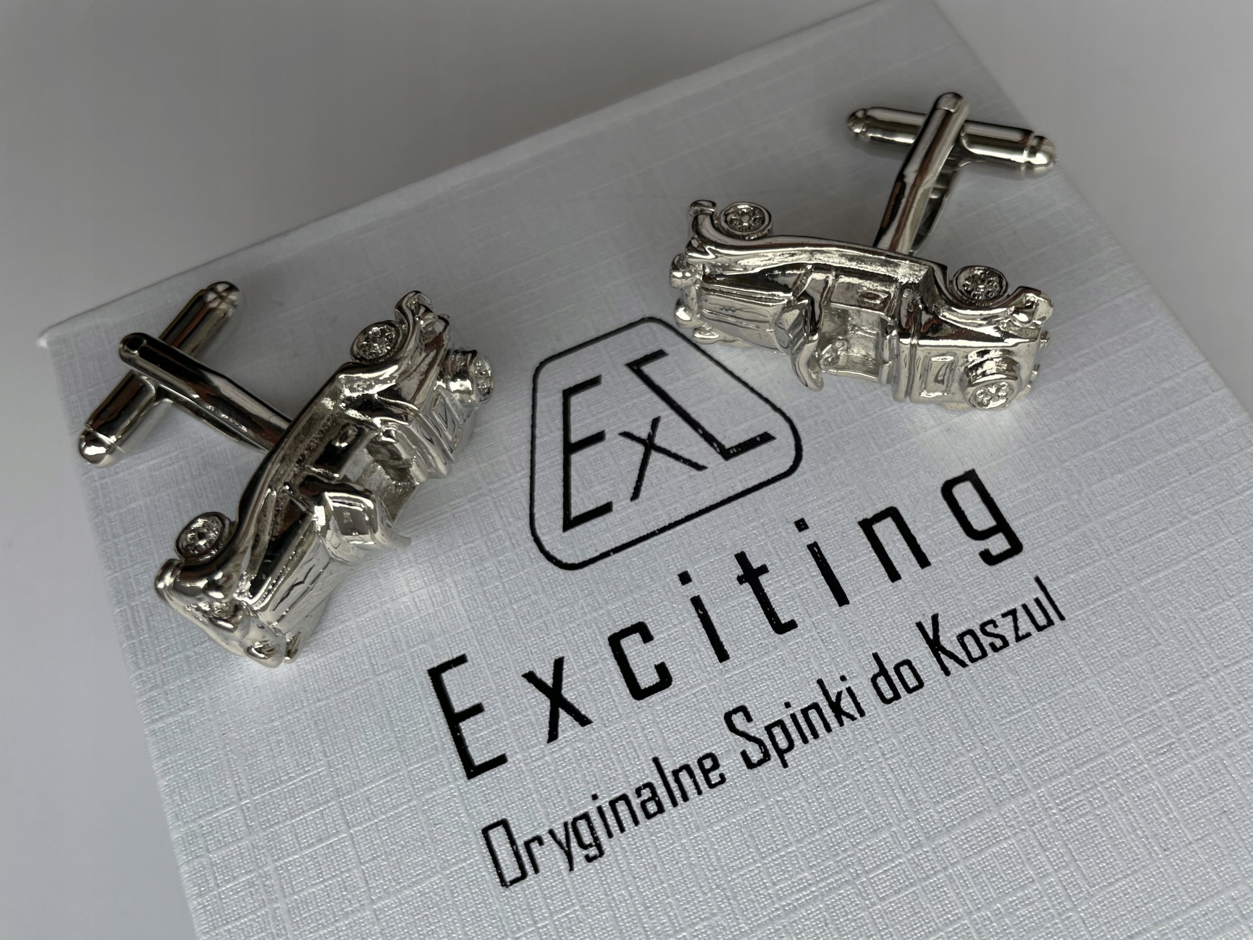 Красиві сріблясті запонки для сорочок у формі гоночної машини Формули-1. Запонки виготовлені з дорогоцінного металу та упаковані в ексклюзивний чохол Exciting із візерунком зміїної шкіри зовні та атласною тканиною та написами «Тільки для тебе» всередині.
