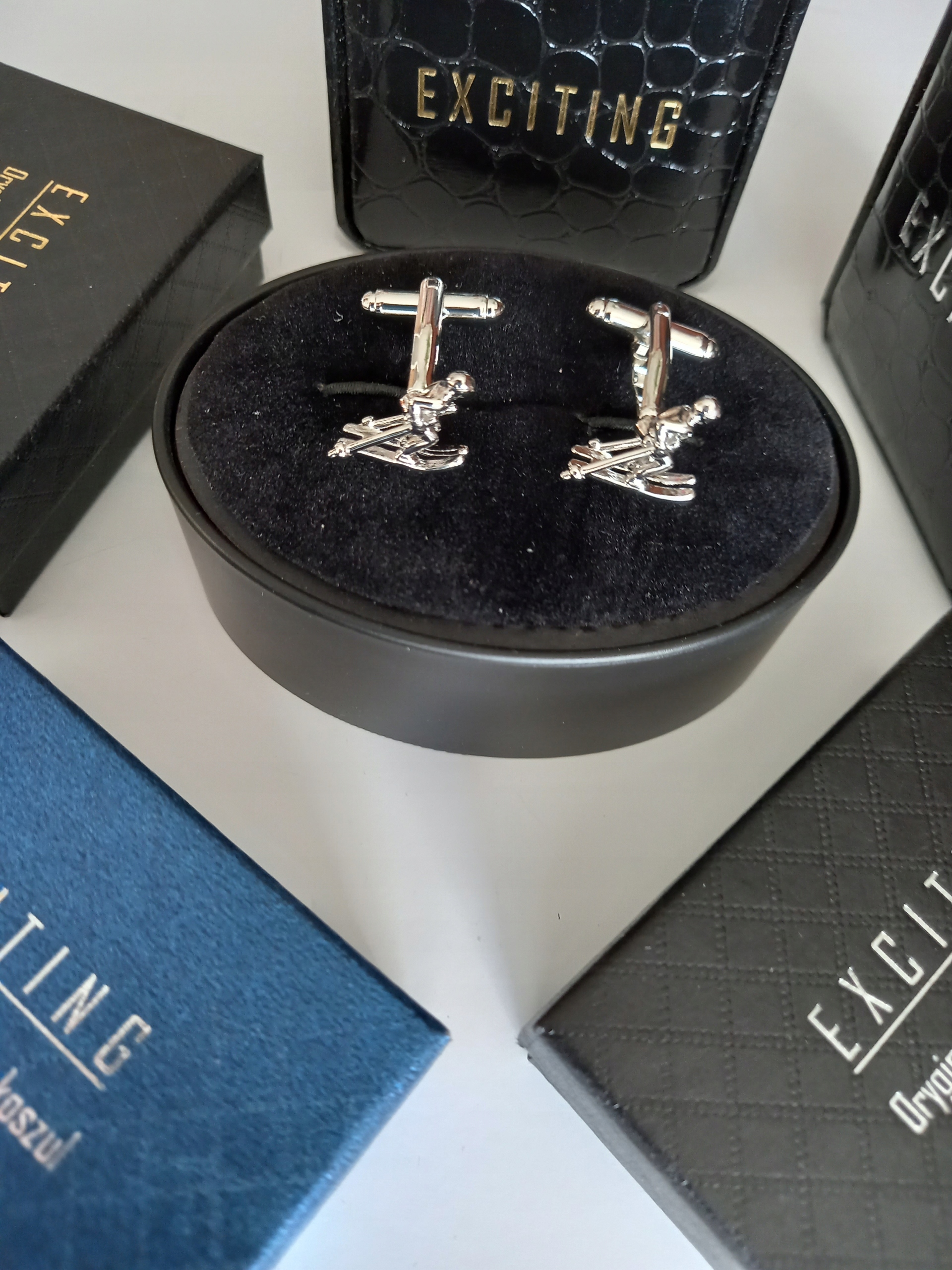 Запонки для сорочок у формі лижників. Запонки виготовлені з дорогоцінного металу. Пара запонок упакована в картонну коробку в декількох кольорах (на вибір, за умови наявності в даний момент в обраному кольорі). За додаткову плату в розмірі 20 злотих ми можемо упакувати запонки в дорожчий, ексклюзивний футляр Exciting, який видно на наступних фотографіях.