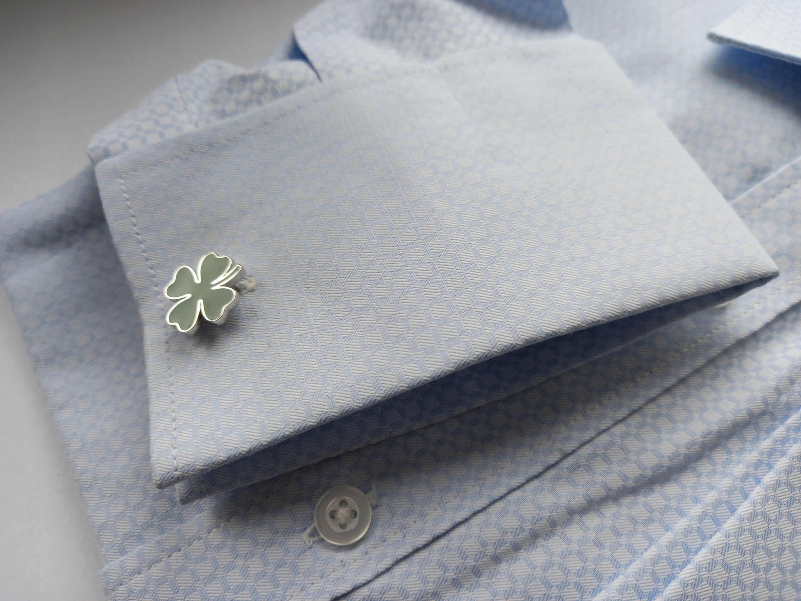 Гарні запонки для сорочки у вигляді зеленої конюшини для випускника. Булавки виготовлені з металу та пофарбовані акриловою емаллю. Пара запонок упакована в ексклюзивний футляр із візерунком зі зміїної шкіри та срібними або золотими написами.