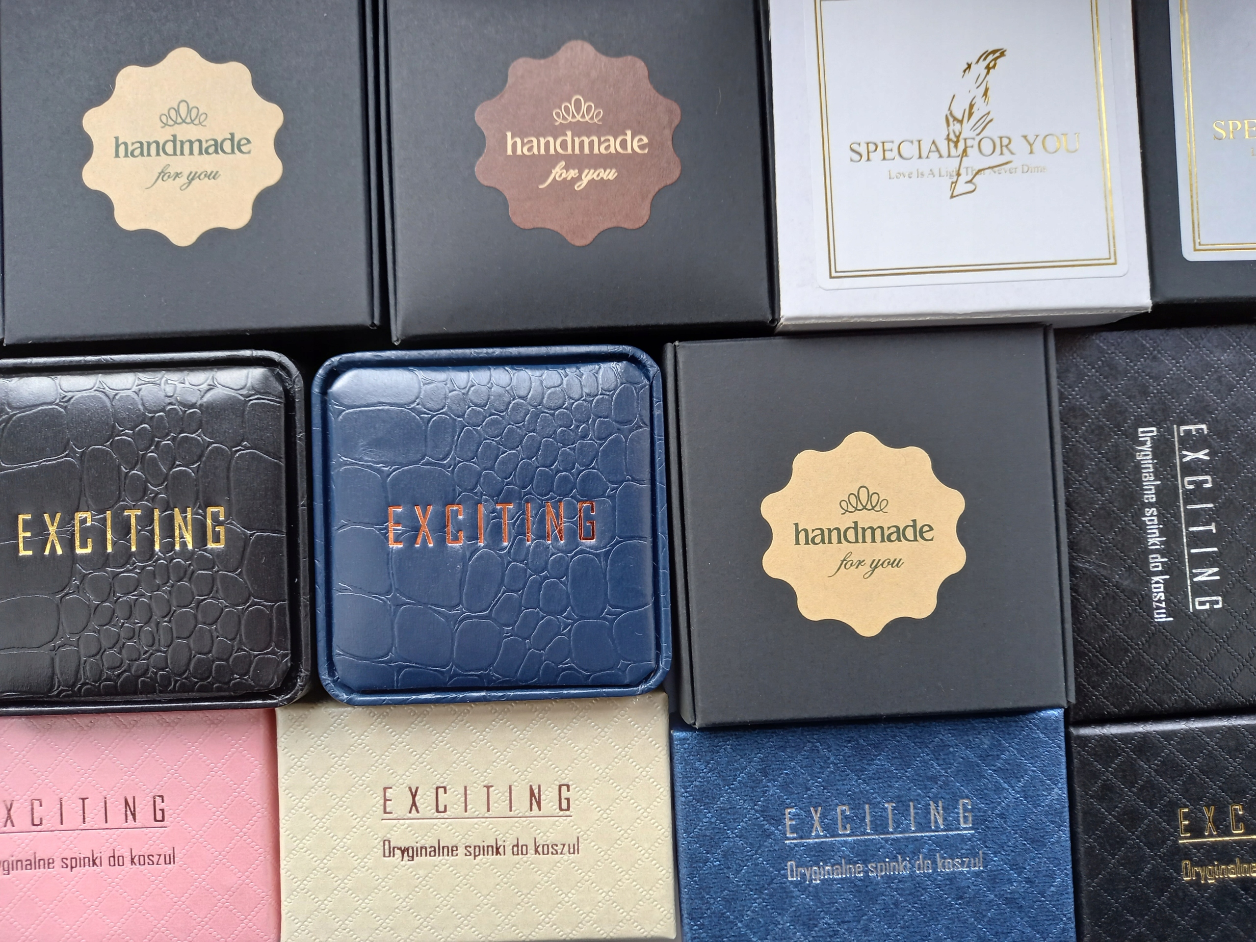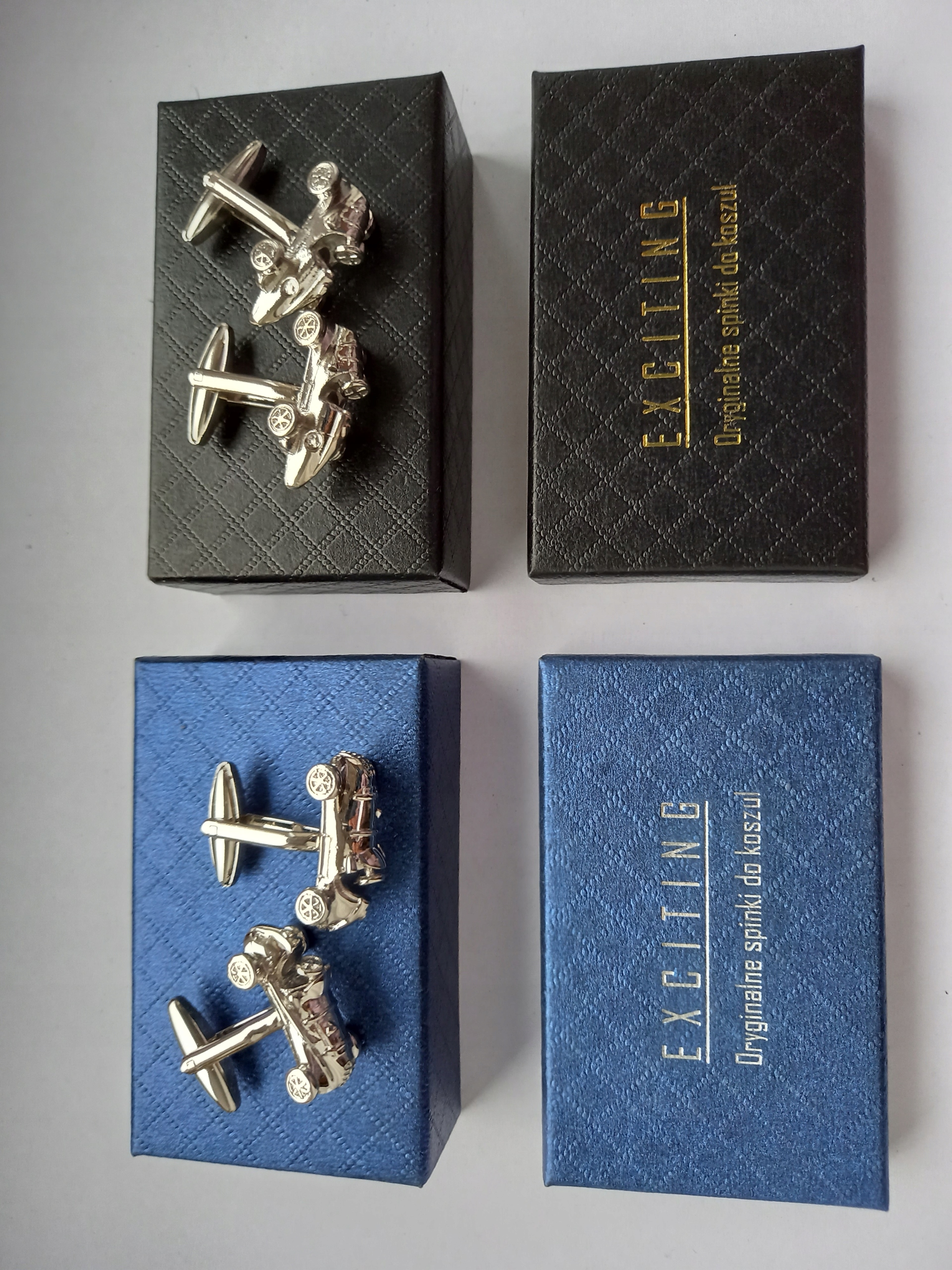 Набір сорочкових запонок від Exciting. Запонки виготовлені з металу. Набір з двох запонок упакований в чорну або кольорову картонну коробку. За додаткову плату ми можемо упакувати запонки в ексклюзивний чохол зі зміїним малюнком, зображеним на наступних фото.