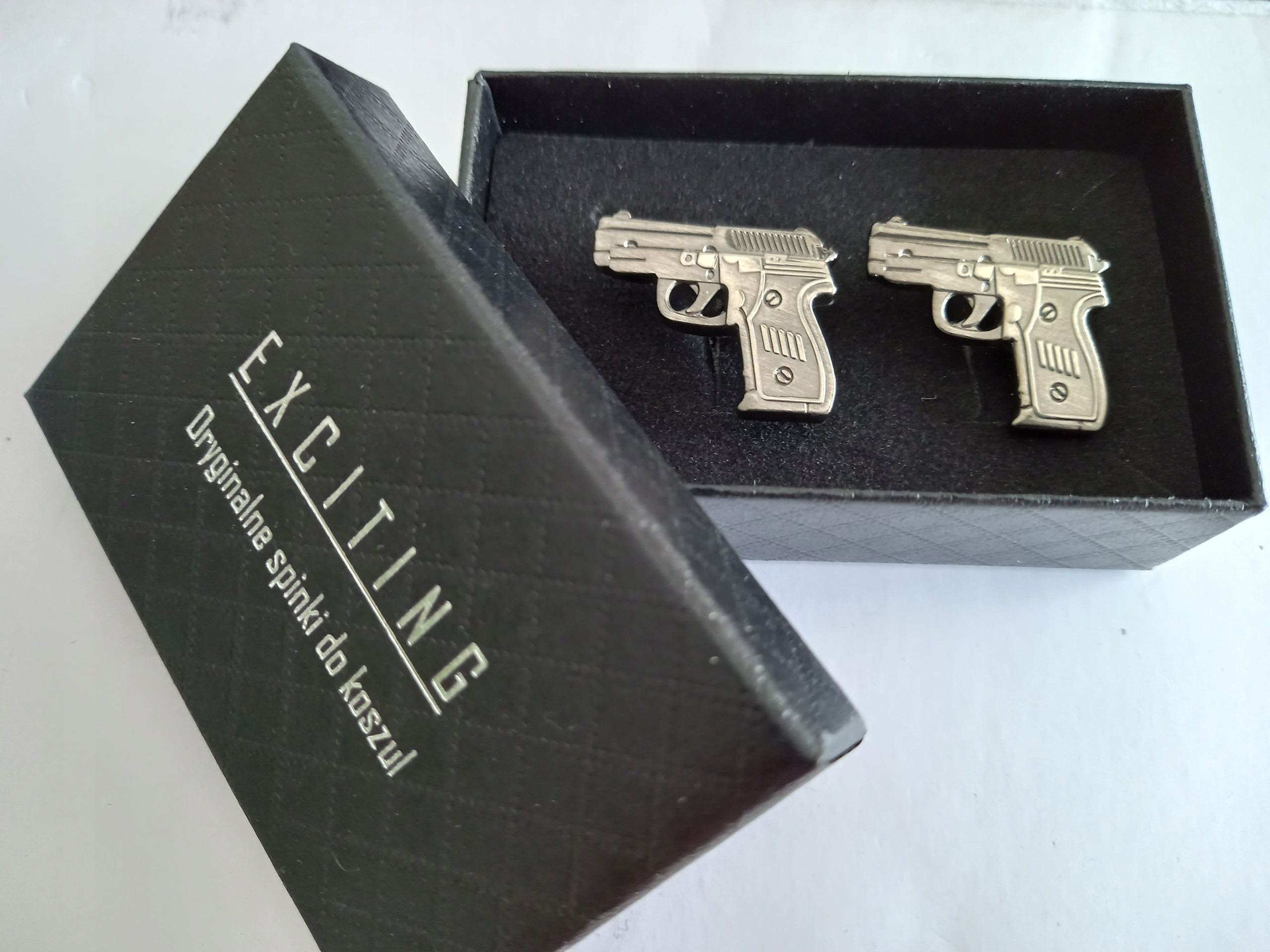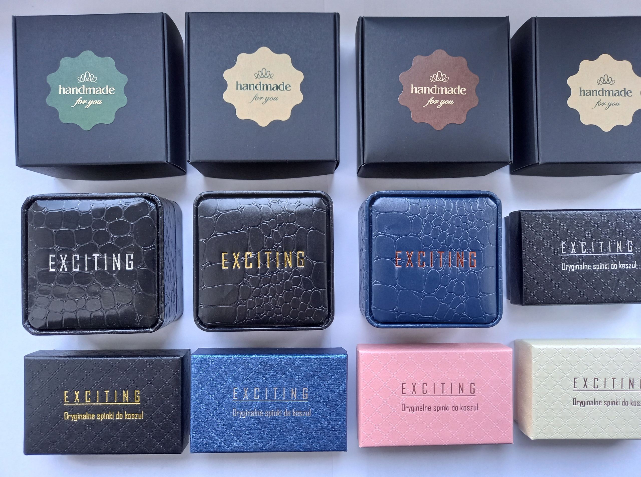 Запонки упаковані в красиву картонну подарункову коробку Exciting (Оригінальні запонки для сорочки) у кольорах до виберіть з; чорний, синій, бежевий або рожевий. За додаткову плату 15 злотих ми можемо надіслати запонки в ексклюзивному футлярі Exciting (Onlu for You) з візерунком зміїної шкіри зовні та білою атласною тканиною та написами всередині.