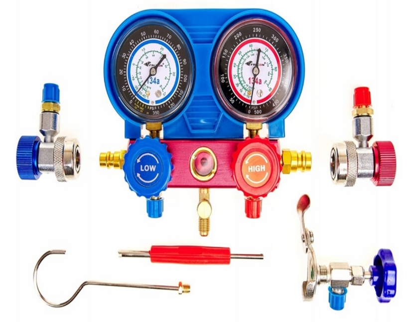 Повний набір для діагностики та заповнення систем кондиціонування за допомогою холодоагентів R22 або R134A. Професійний комплект тестування та наповнення кондиціонування кондиціонування є ідеальним рішенням для систем кондиціонування кондиціонування. The kit is equipped with quick connectors for the protection and safety of the refrigerant, with a built-in sight glass to monitor the condition and flow of the refrigerant.