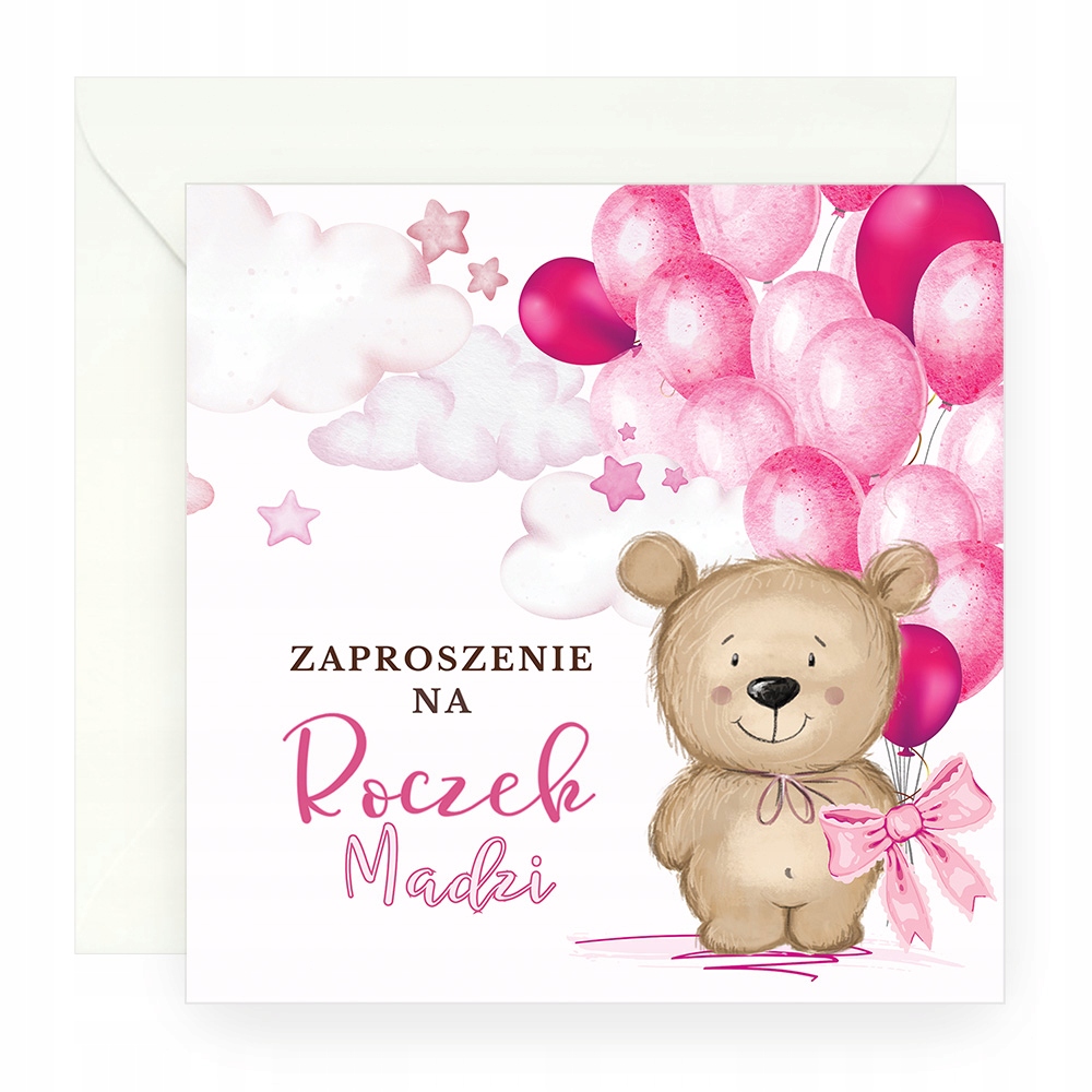 Запрошення, персоналізовані протягом року рожевий плюшевий ведмедик AP13_04 Білий конверт