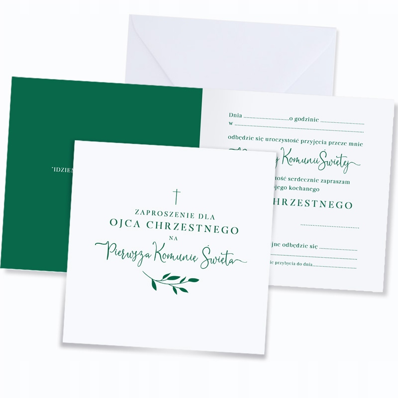 - Елегантне запрошення причастя для матері та хрещеного батька зроблено на високоякісній папері. Запрошення до причастя для хрещених пар, що зберігаються в білих кольорах, збагачені красивим кольором пляшки. Обкладинка має символ хреста, а також ніжна гілка з листям. Обкладинка показує напис: запрошення до хрещеного батька до першого святого Причастя. Інтер'єр запрошення зліва знаходиться в кольорі пляшки зеленого кольору, і саме тут текст святого Августина: ми йдемо до Бога, до речі, а не любов'ю. Права сторона запрошення містить текст для написання та доповнення інформацією про церемонію причастя. Ми будемо прикріплюватися до запрошень, що відповідають квадраті, білих конвертів.
