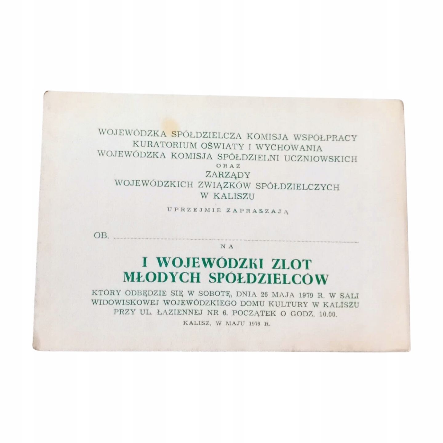 Продам незаповнене запрошення на 1-й воєводський з’їзд молодих кооперативів – Каліш, 26 травня 1979 р. Запрошення видано: Воєводською комісією кооперативної праці, Управою освіти та виховання, Воєводською комісією студентських кооперативів та управами воєводських кооперативних спілок. в Каліші. Програма заходу на звороті. Обмежений тираж - вийшло всього 250 примірників. Хороший стан. Кути трохи загнуті. Незначний бруд. Розмір 15,2 х 10,5 см.