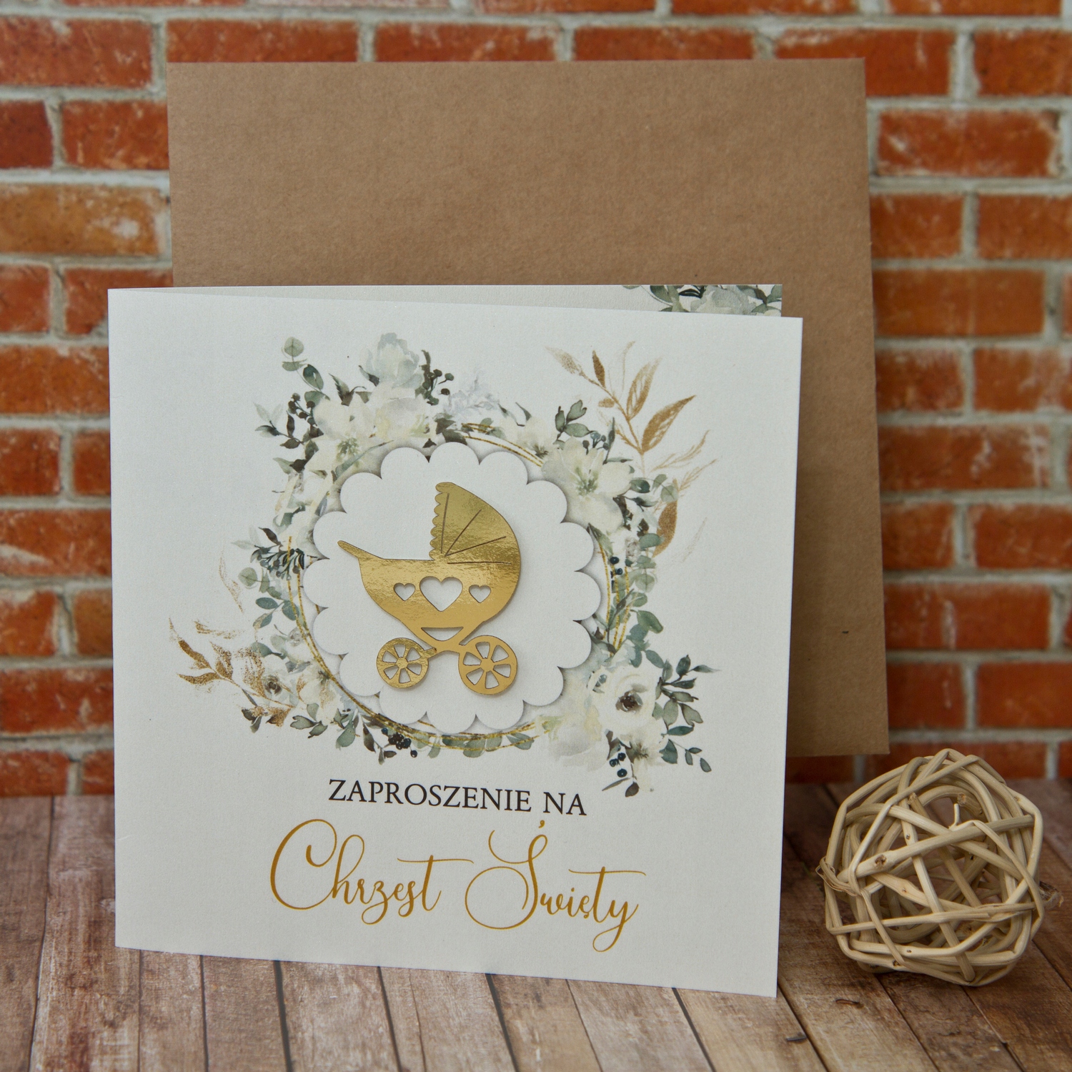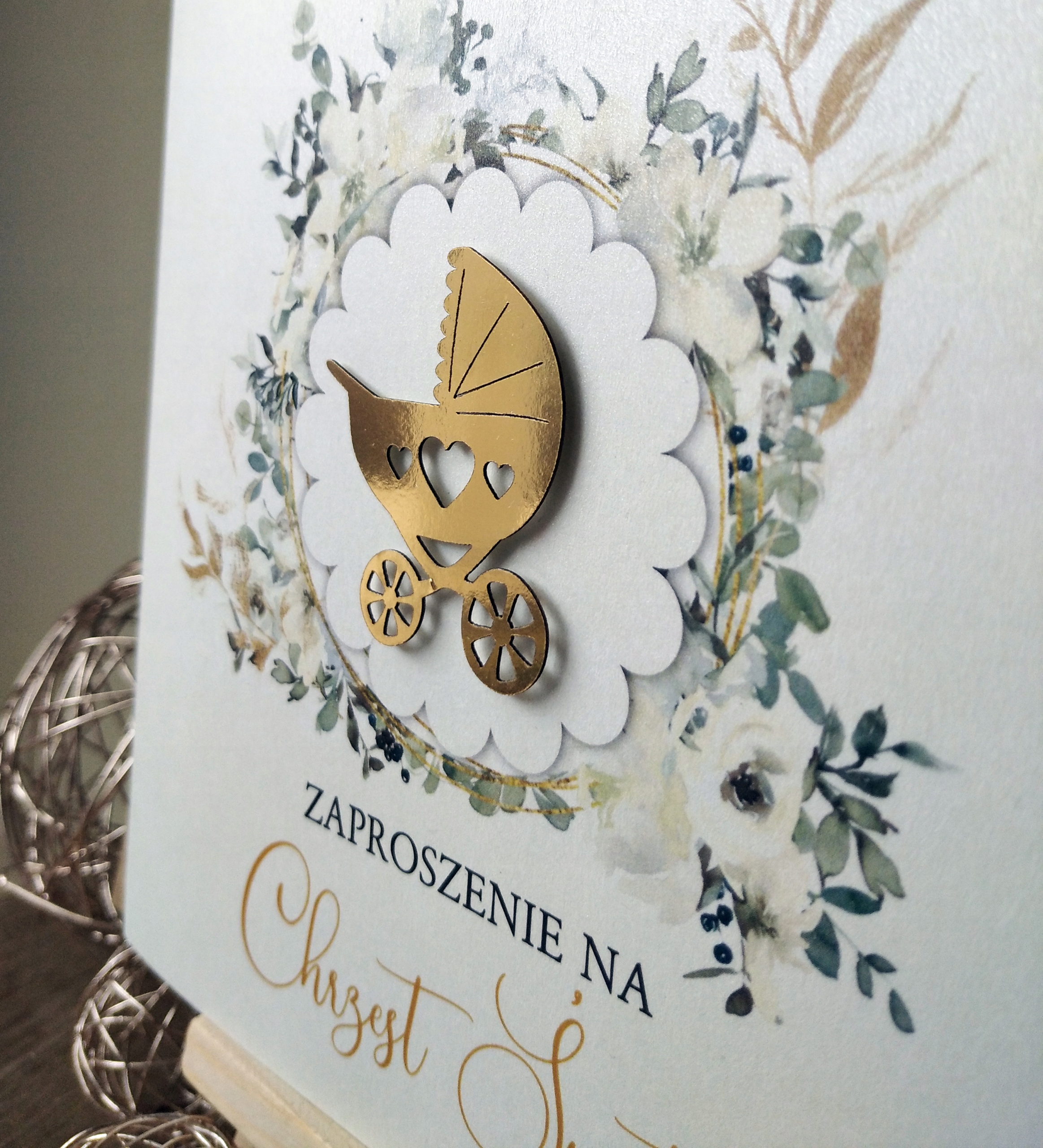 - Запрошення прикрашено вирізаним лазером елементом 3D візок із золотого дзеркального паперу