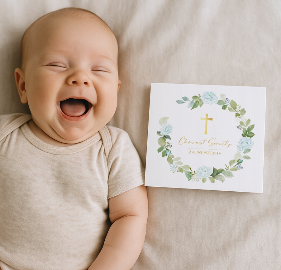 Запросіть своїх близьких на унікальну церемонію хрещення в прекрасному, класичному стилі. Представлене запрошення вражає делікатесом - Золотий хрест, розміщений у центрі флористичного вінку синіх троянд і зелені створює тонку, урочисту композицію. Відмінний вибір для батьків, які цінують естетику та елегантність.