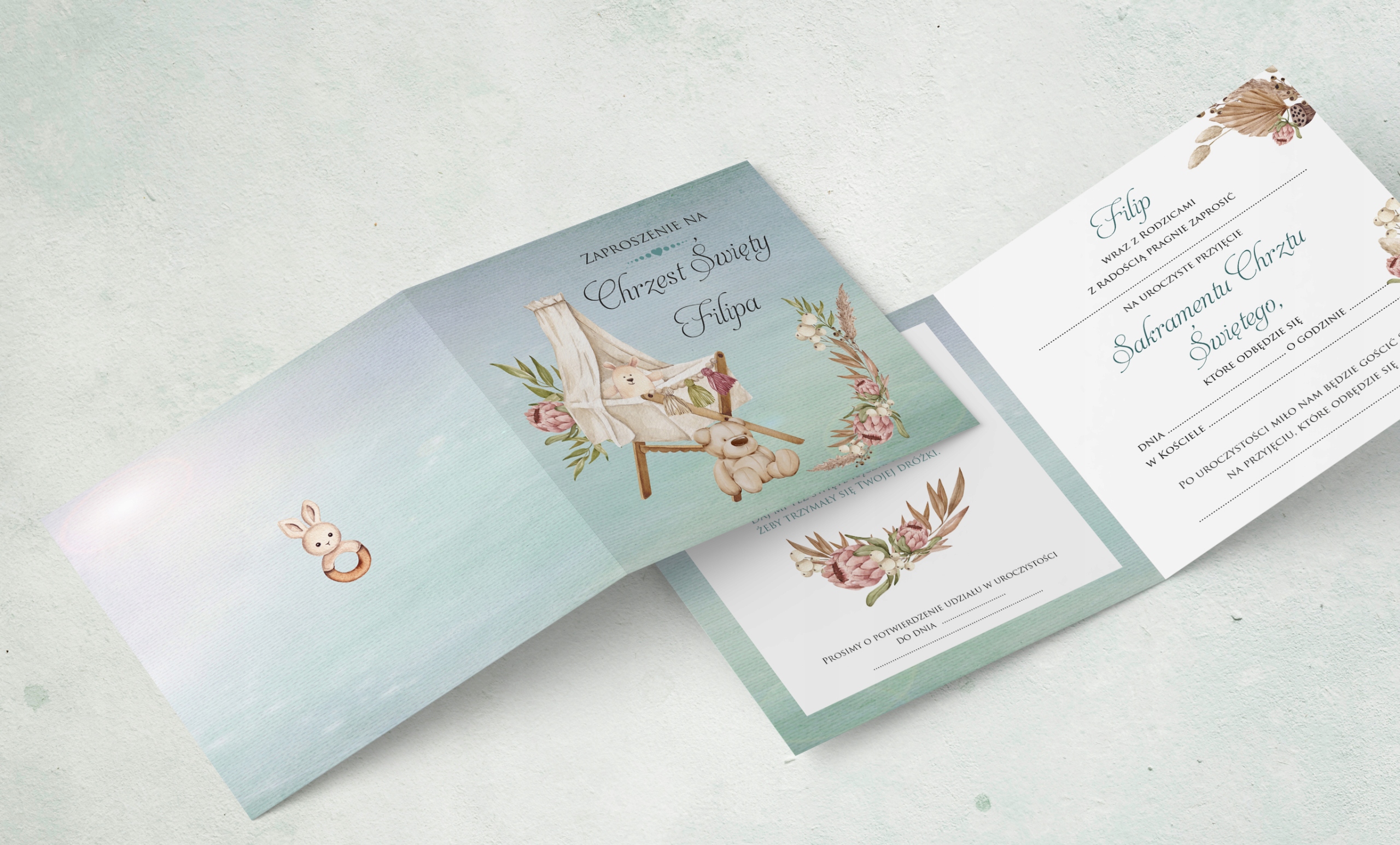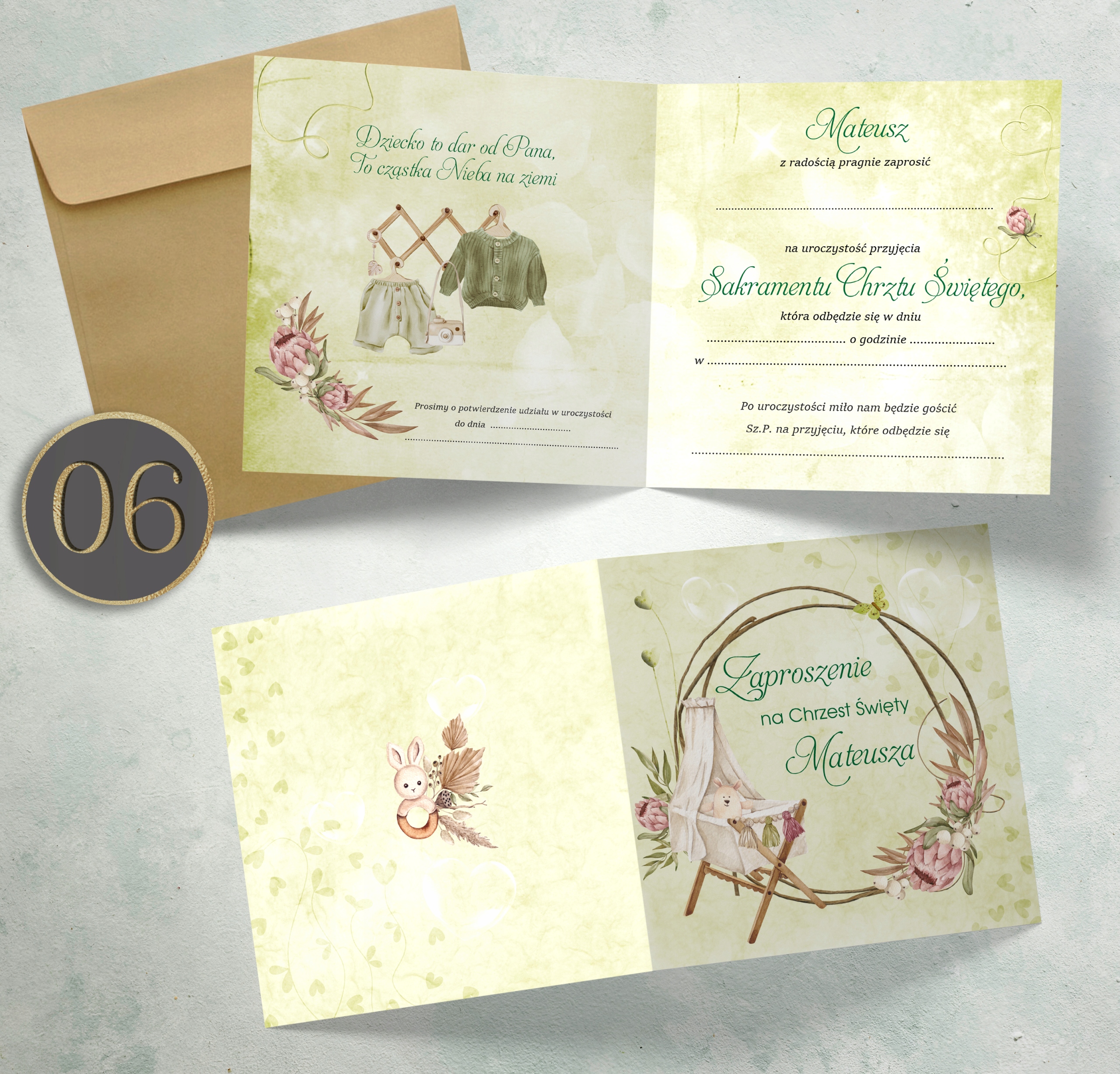 - ім’я дитини x 2, тобто: 1 x для обкладинки, наприклад, запрошення на хрещення Антонія; 1 x до вмісту запрошення, наприклад, Antoś