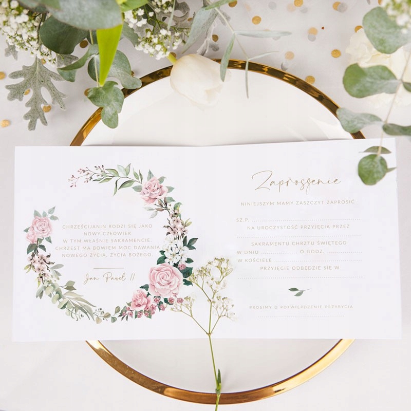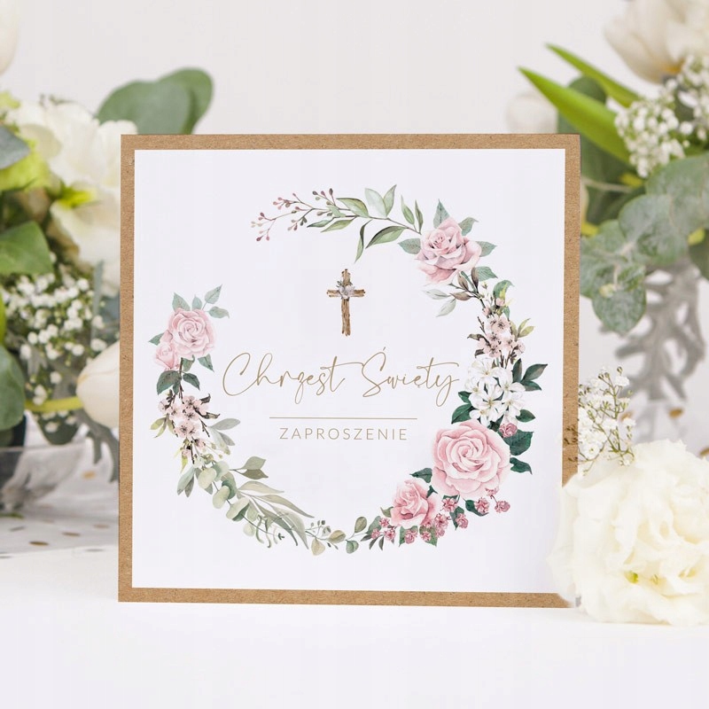 - принт: матовий; запрошення прикрашені принтом квіткового вінка, дерев'яного хреста та золотим написом: Святе Хрещення і Запрошення; обкладинка запрошення має крафтову рамку