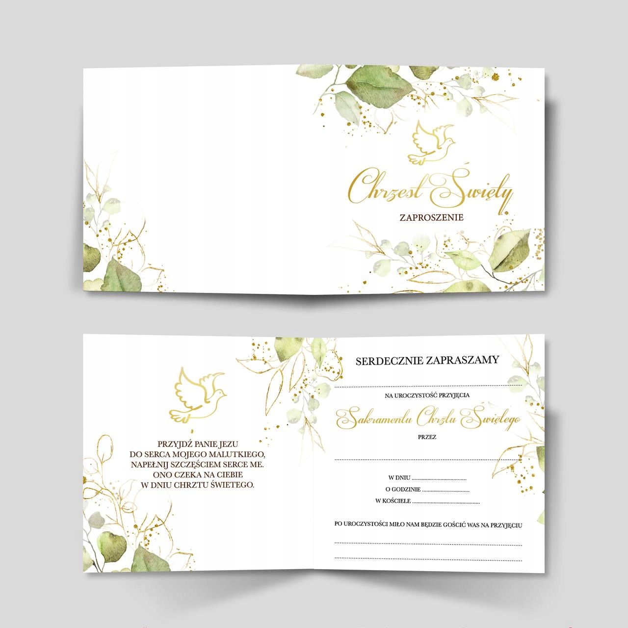Надзвичайно чарівні та чудові запрошення на Святе Хрещенняелегантно прикрашені зеленими листочками. Завдяки використанню пастельного зеленого кольору вони виглядають ефектно. Вони прикрашені мотивом маленького золотого голуба, що ідеально відповідає характеру церемонії. Внутрішня частина запрошення на хрещення прикрашена красивою цитатою.
