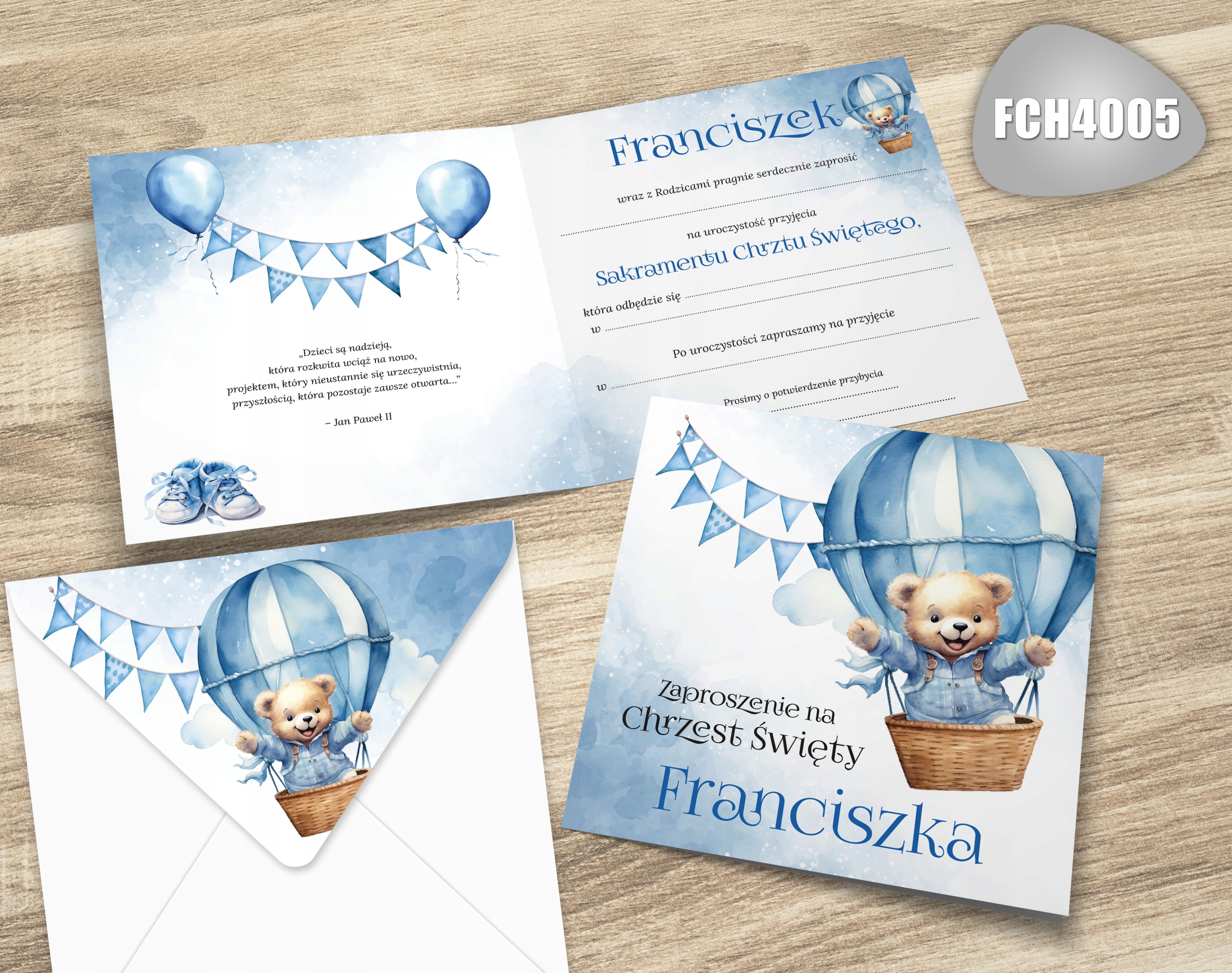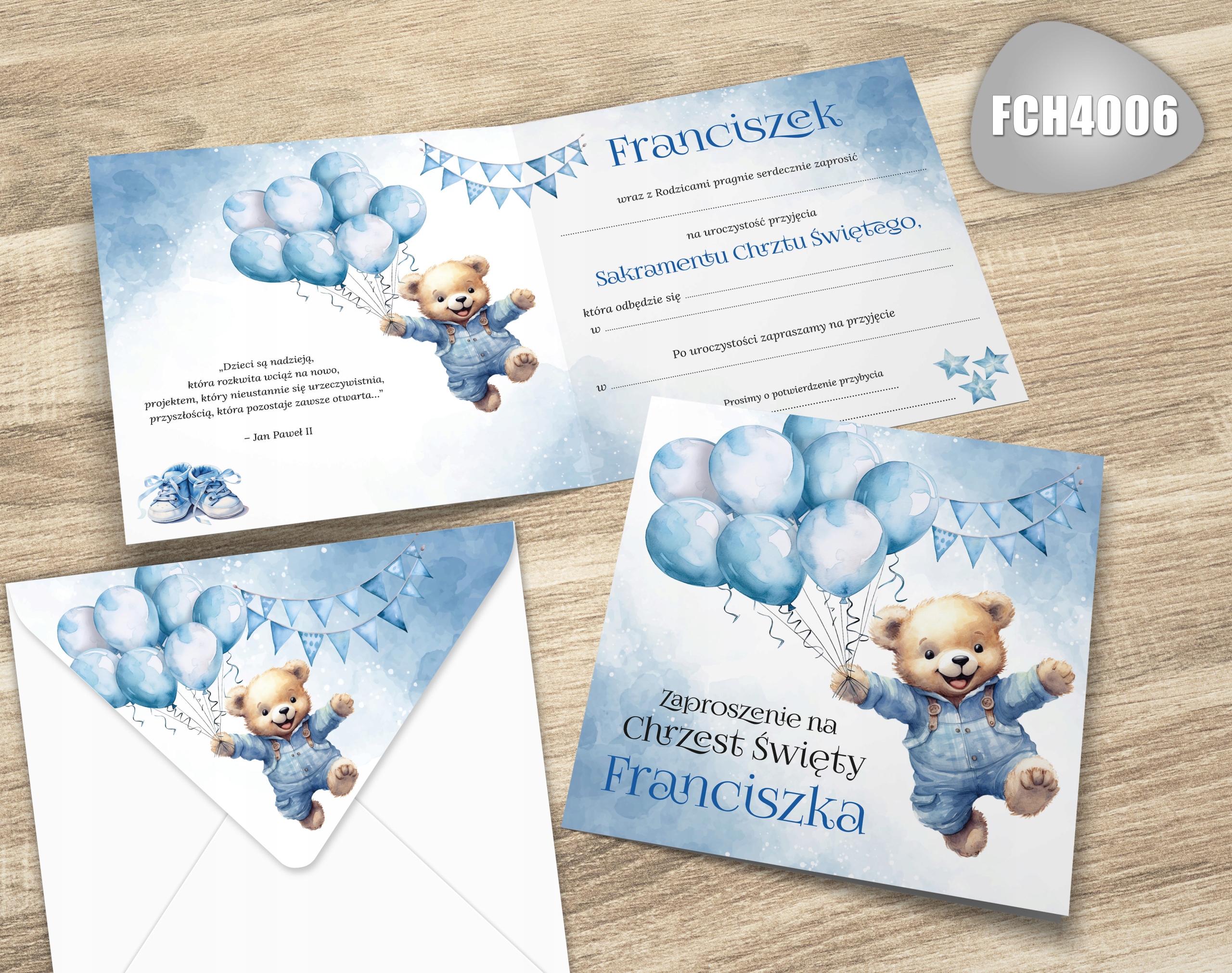 Запрошення на хрестини, казкові ведмедики, ім'я дитини, КОНВЕРТ З ПРИНТОМ