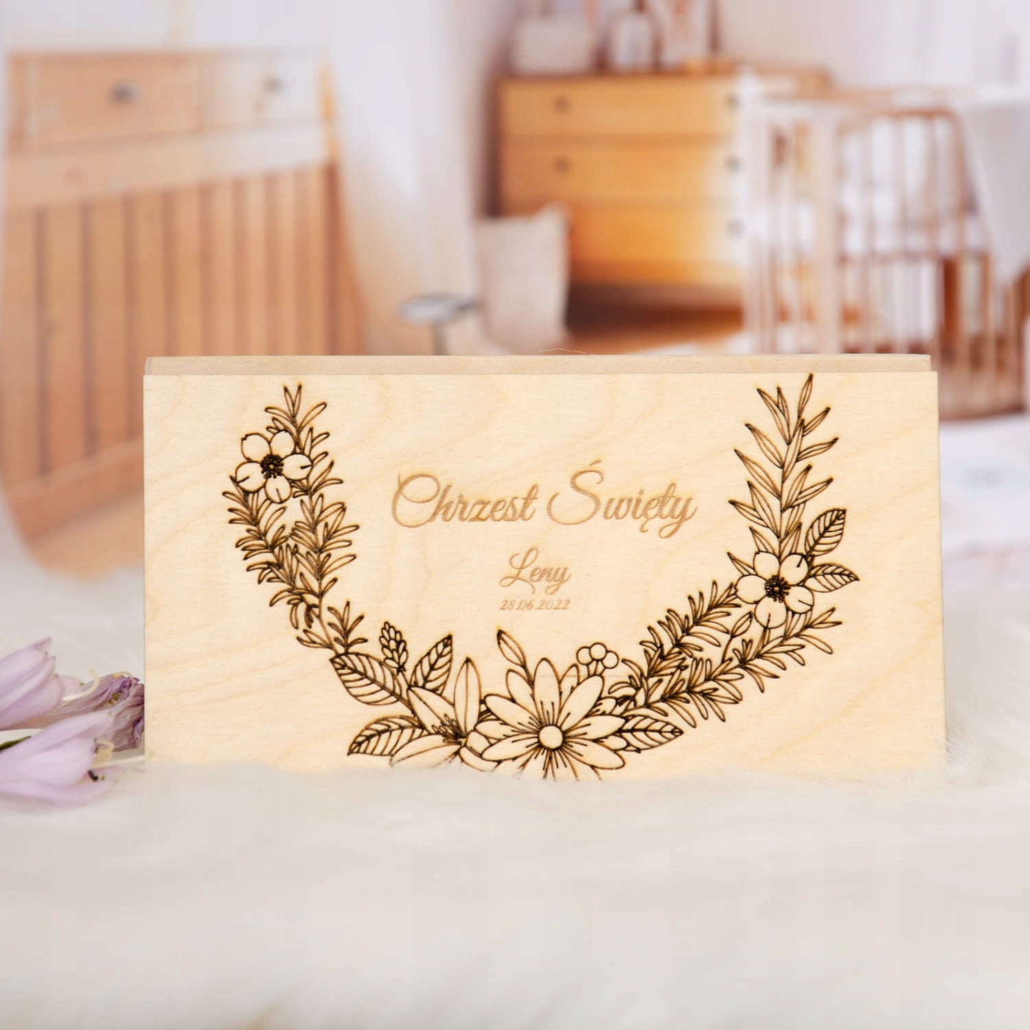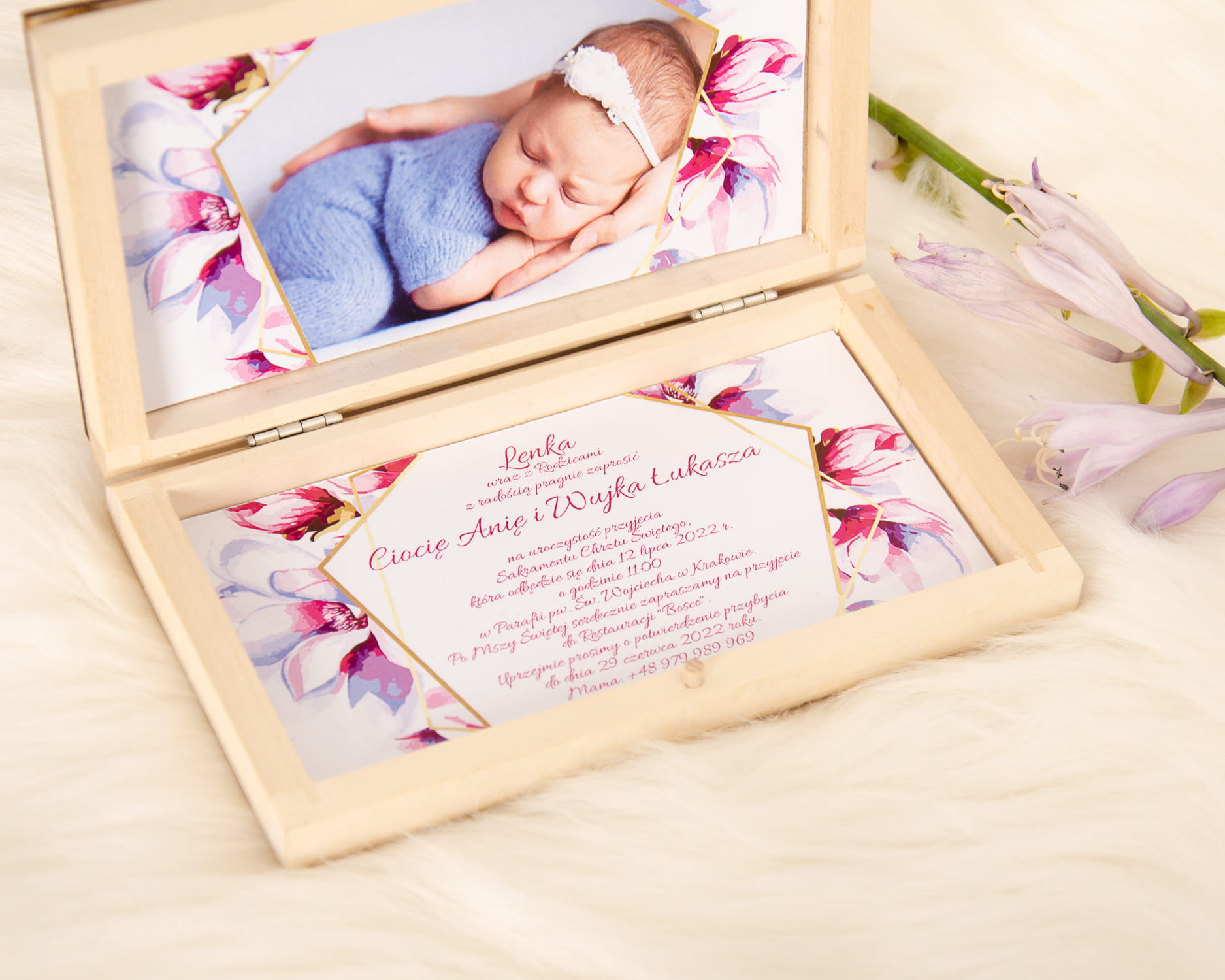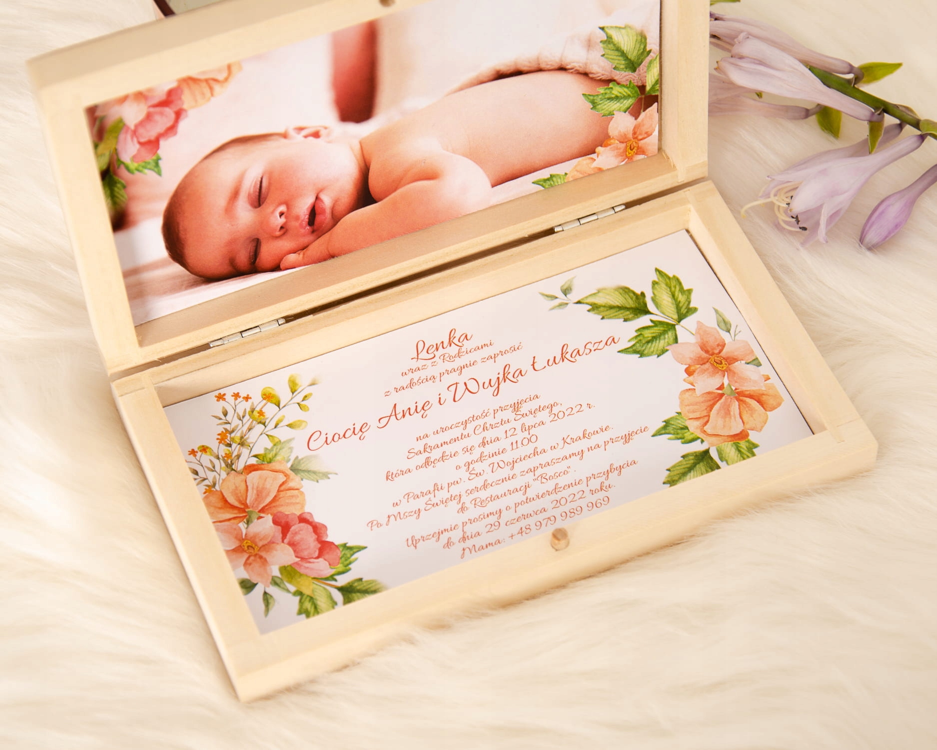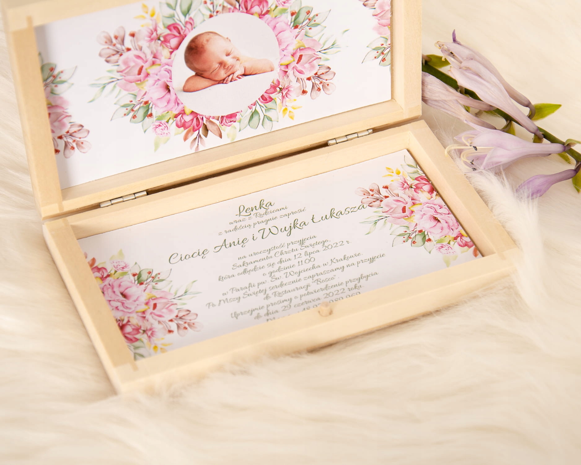 Красиве іменне запрошення в дерев'яній коробці з фотографією дитини.