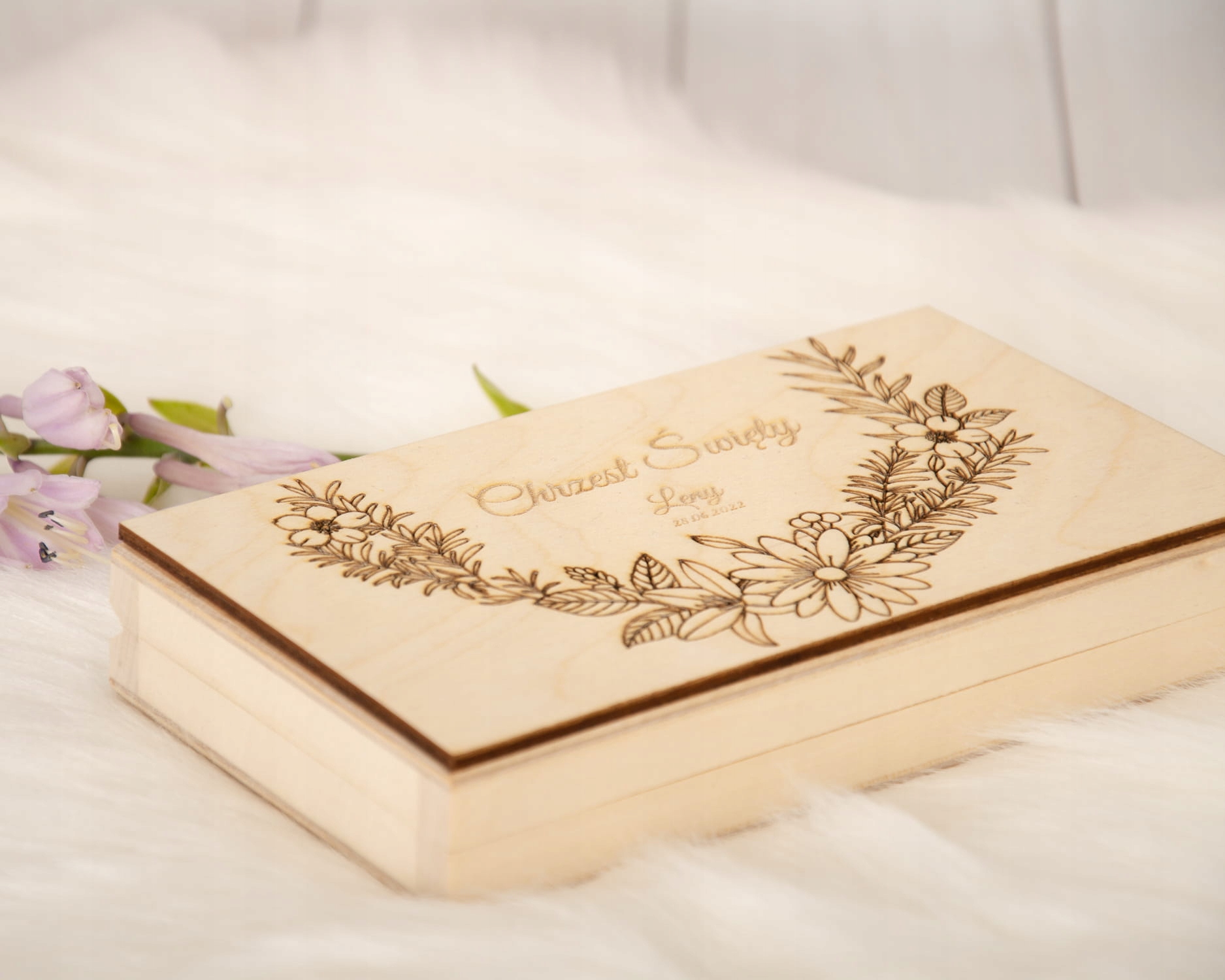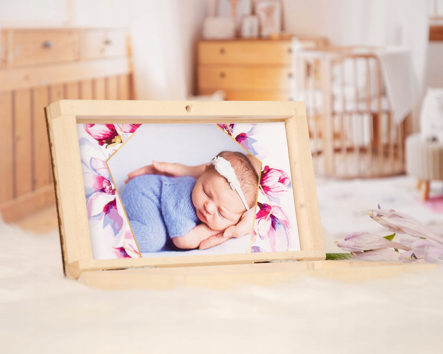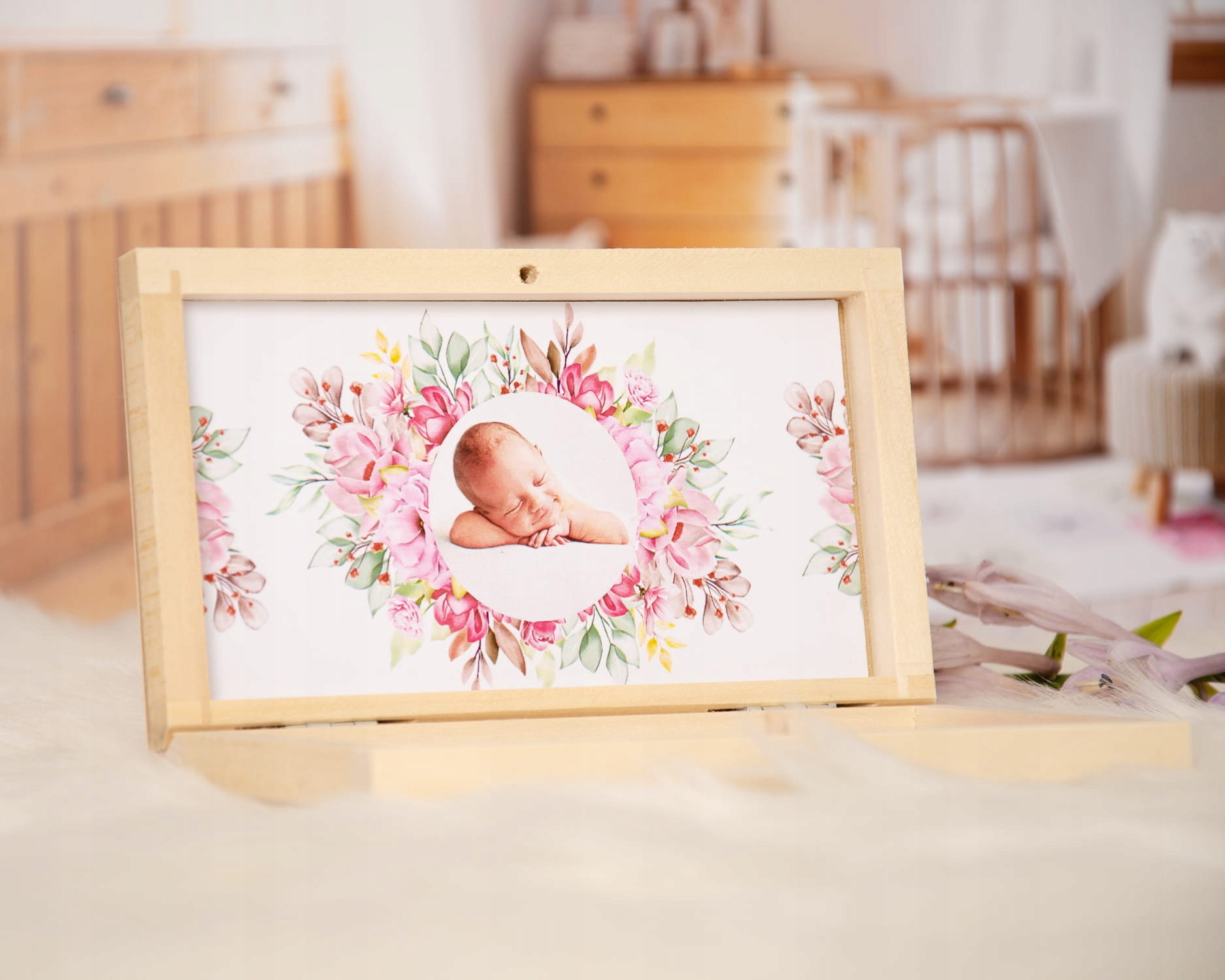 Красиве іменне запрошення в дерев'яній коробці з фотографією дитини.