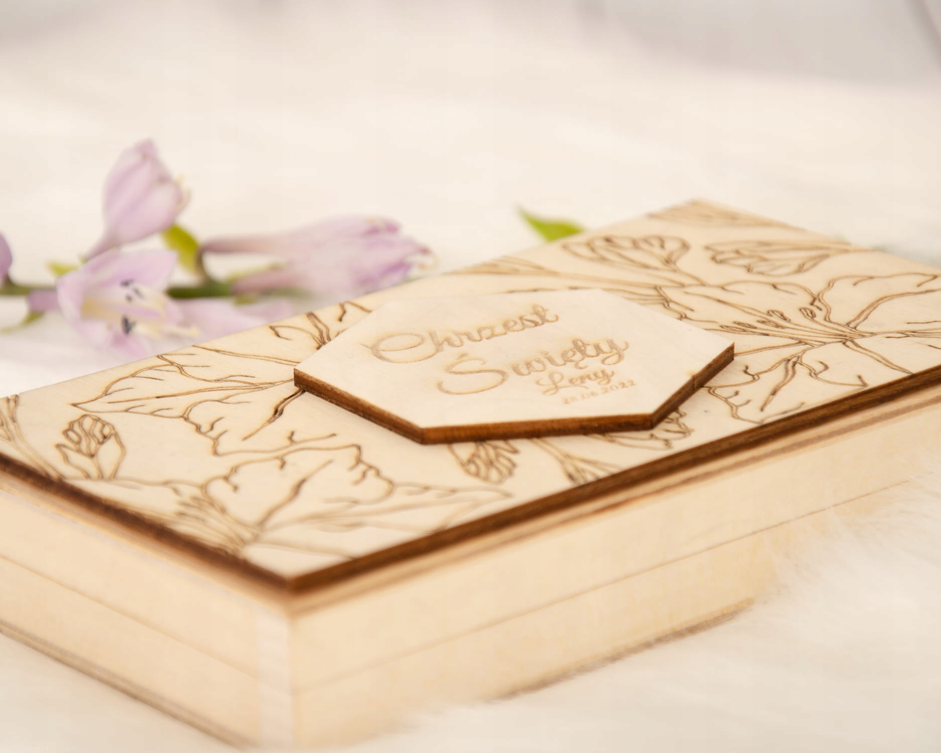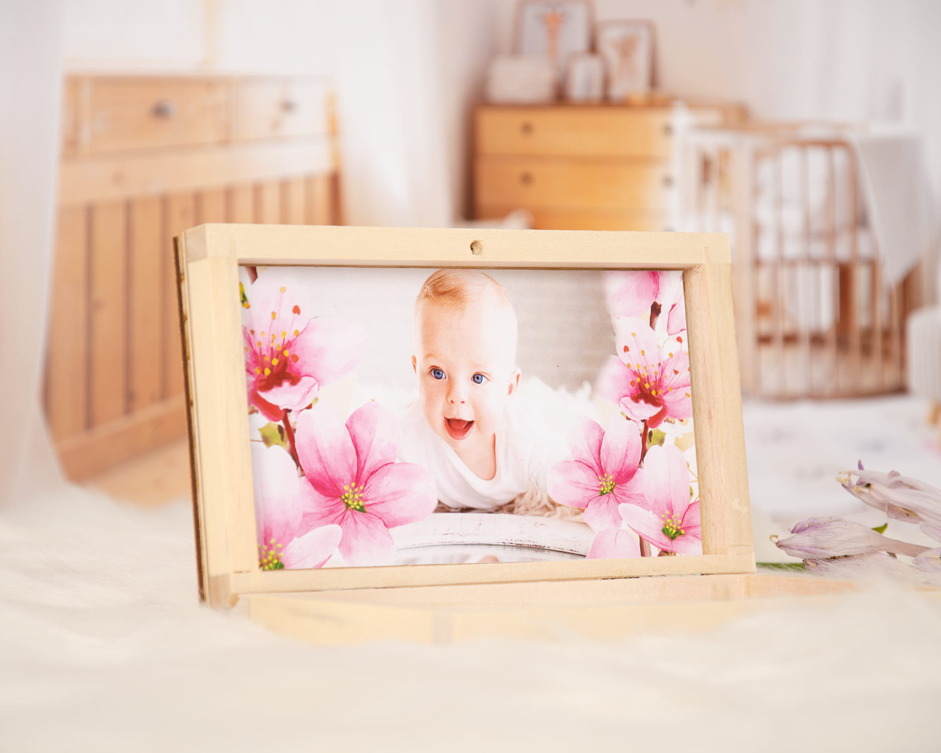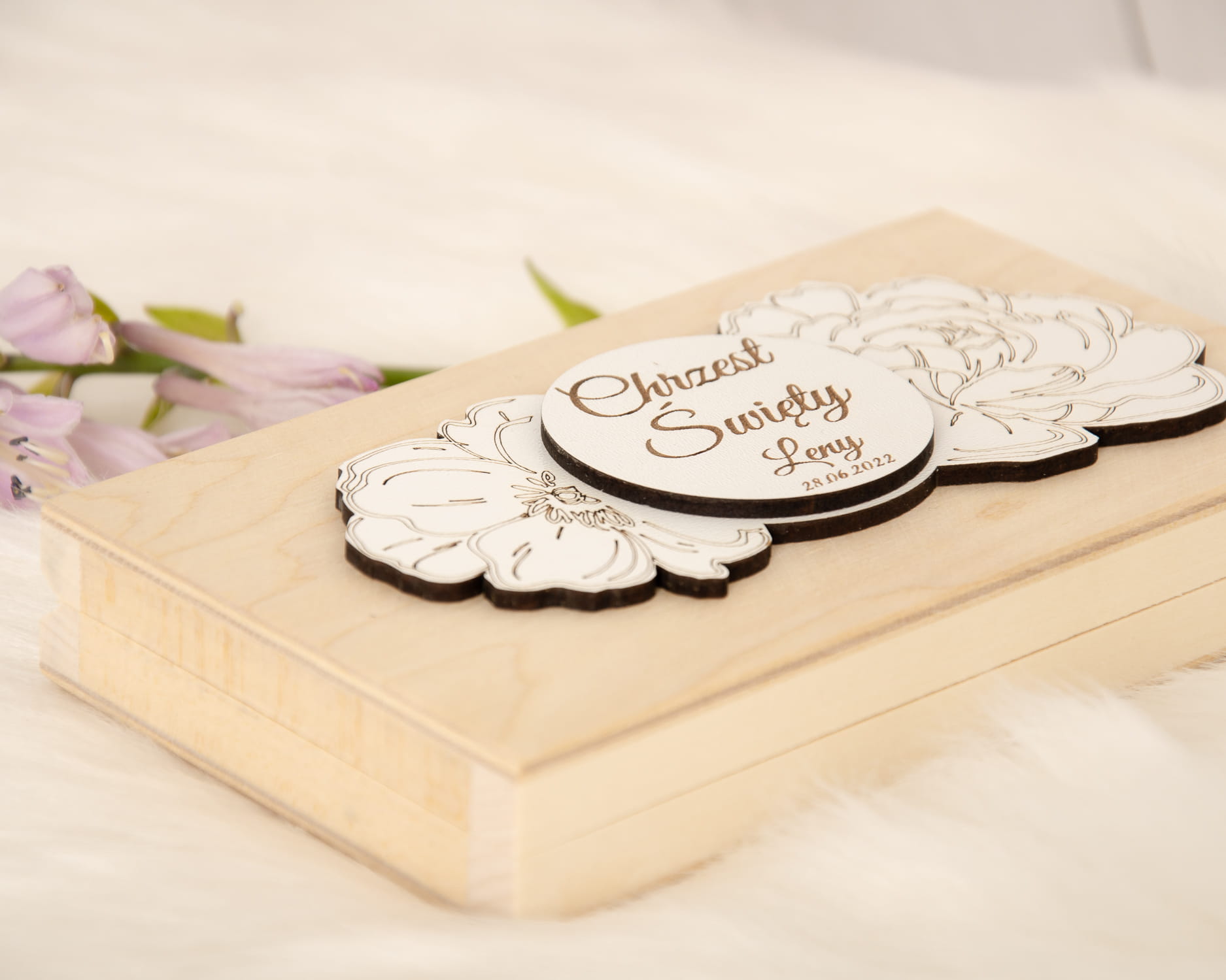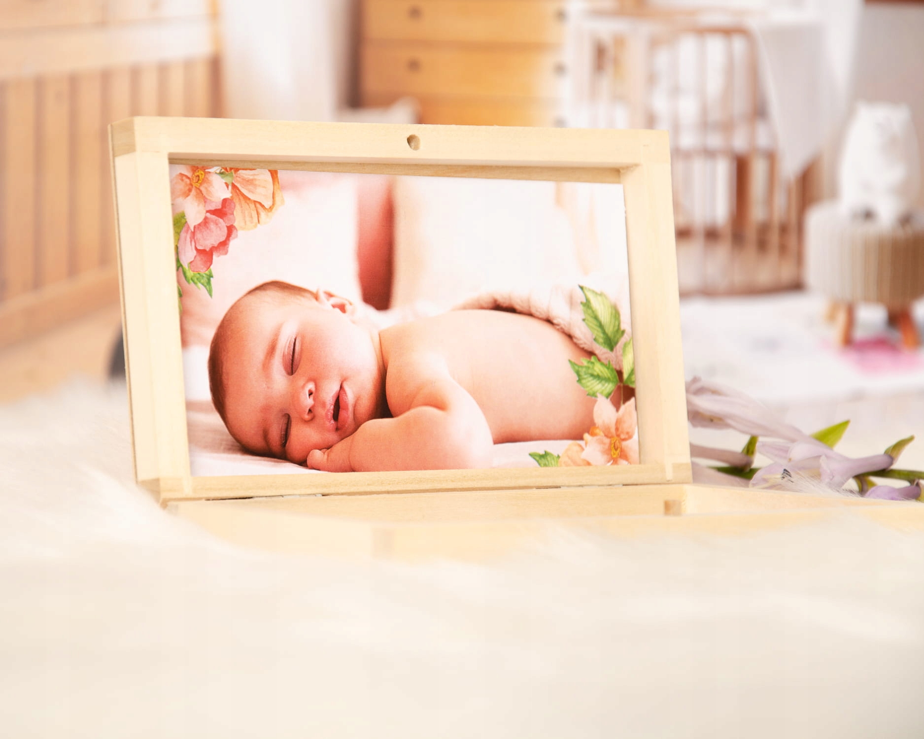 Красиве іменне запрошення в дерев'яній коробці з фотографією дитини.