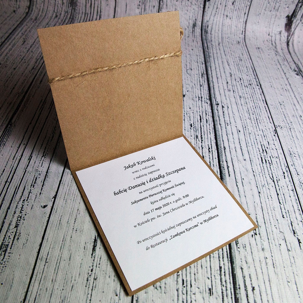 ☑️ Ця пропозиція поширюється на запрошення до Святого Причастя, виготовлені з паперу вагою 300 г і розміром 13,5 х 13,5 см. Інші елементи, такі як колір паперу, тип шнурка тощо, є питанням індивідуальної персоналізації.