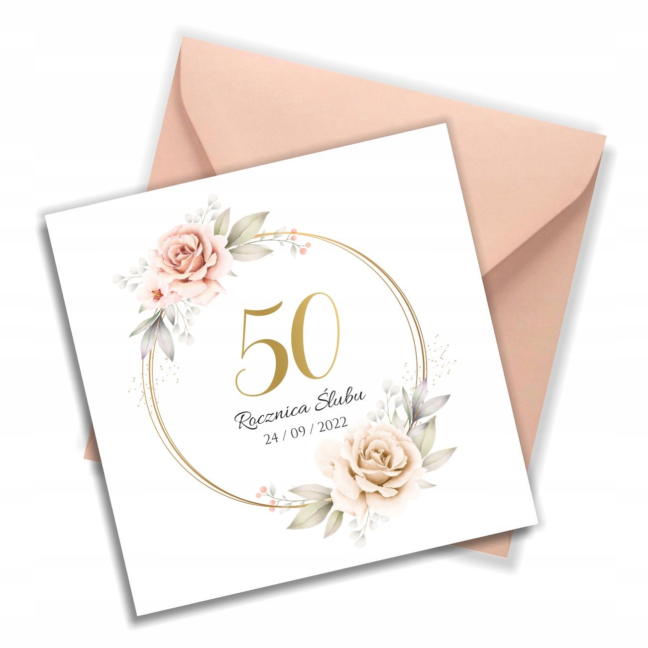 Запрошення на річницю весілля з ніжною квітковою графікою, виготовлене на щільному атласному папері. Запрошення повністю персоналізоване. Додатково до запрошення додається конверт.