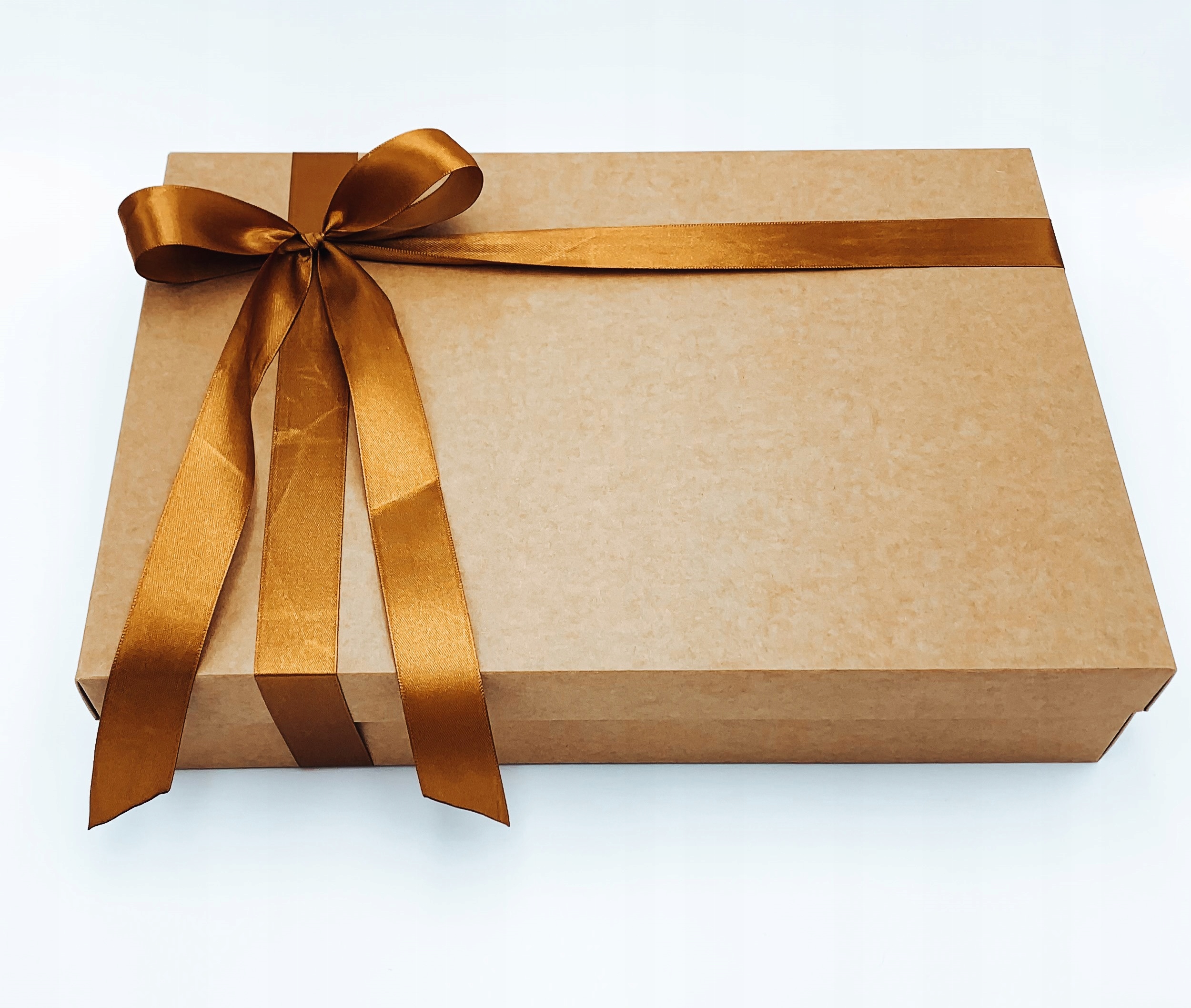 Коробка закрита окремою кришкою, зав'язана елегантно із золотою/мідною стрічкою.