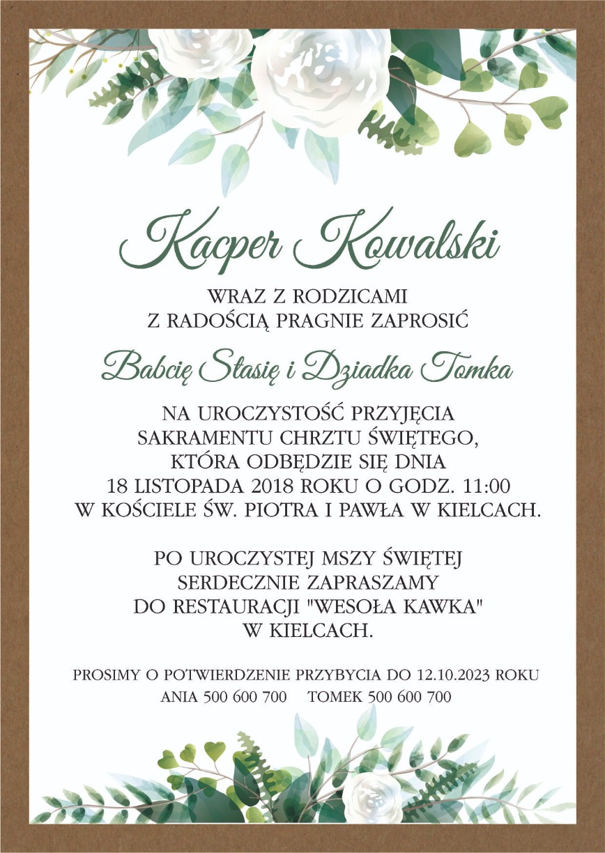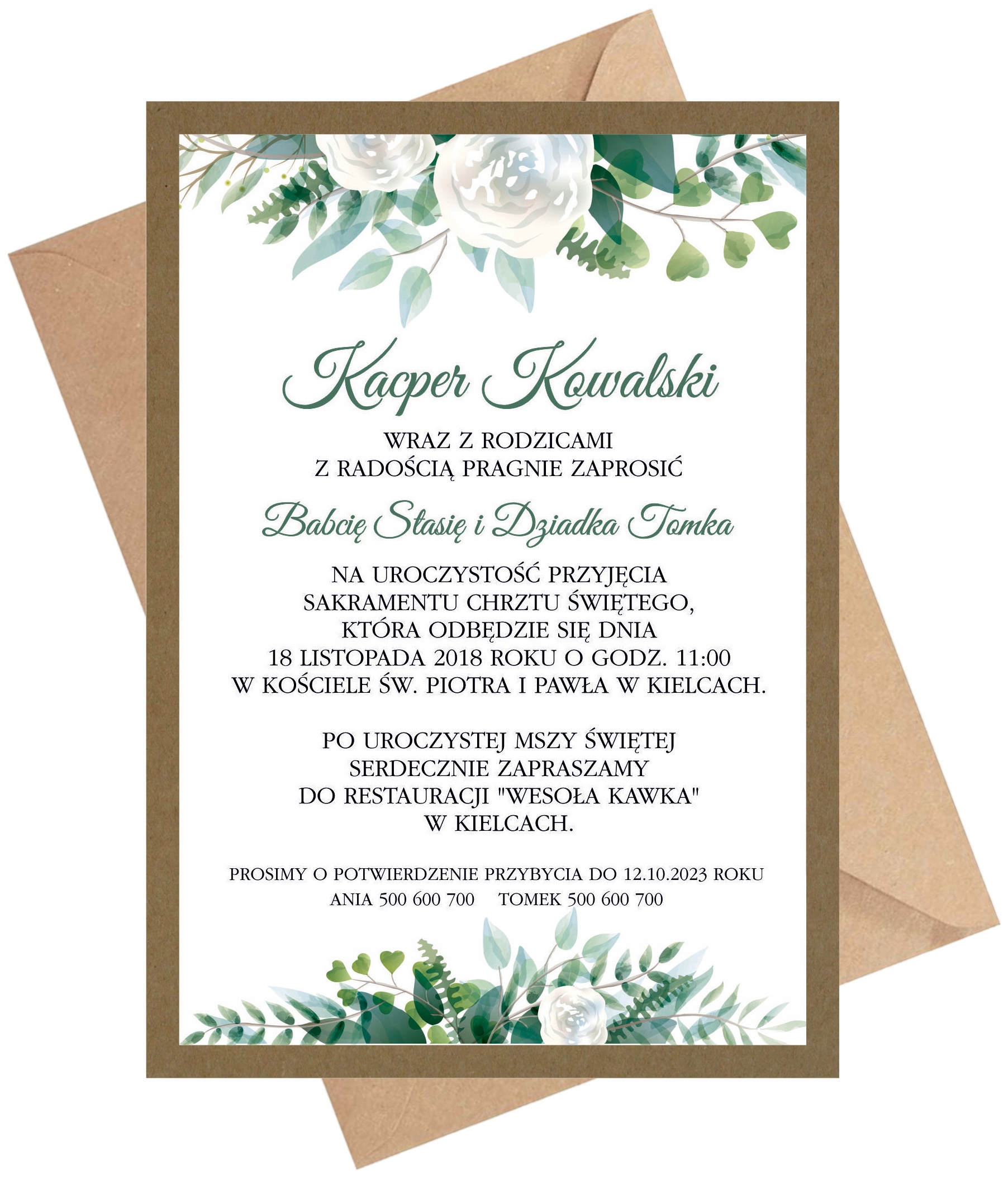 Спереду з декоративним 3D мотивом шарфа, вирізаним з італійського паперу на зеленому декоративному тлі, а також іменем дитини, все на тлі з красивим рослинним мотивом, який ідеально підходить до характеру свята.