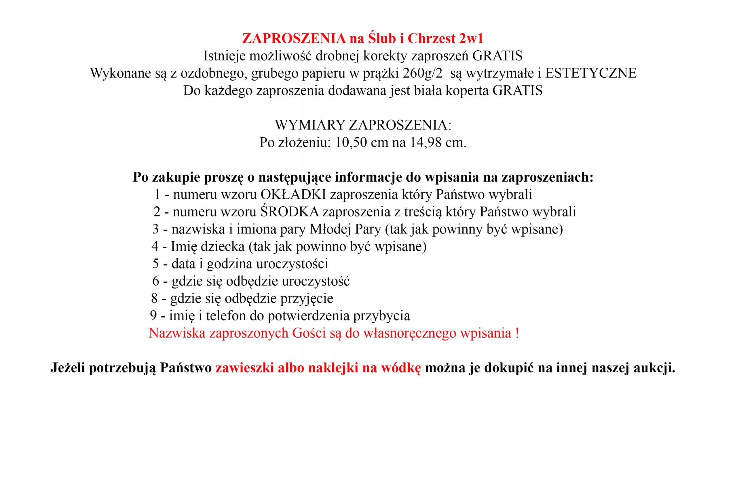 Оплачивая «Приглашения на свадьбу и крещение 2 в 1 + конверт», вы можете быть уверены, что данное изделие из каталога «Свадебные приглашения, уведомления» будет доставлено из Польши и проверено на целостность. В цене товара, указанной на сайте, учтена доставка из Польши. Внимание!!! Товары для Евросоюза, согласно законодательству стран Евросоюза, могут отличаться упаковкой или наполнением.