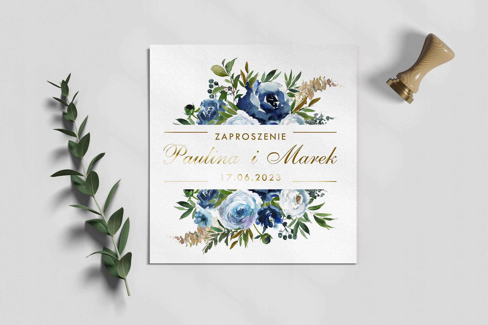 Весільні запрошення з геометричним золотим мотивом у поєднанні з аквареллю квітів у відтінках темно-синього.