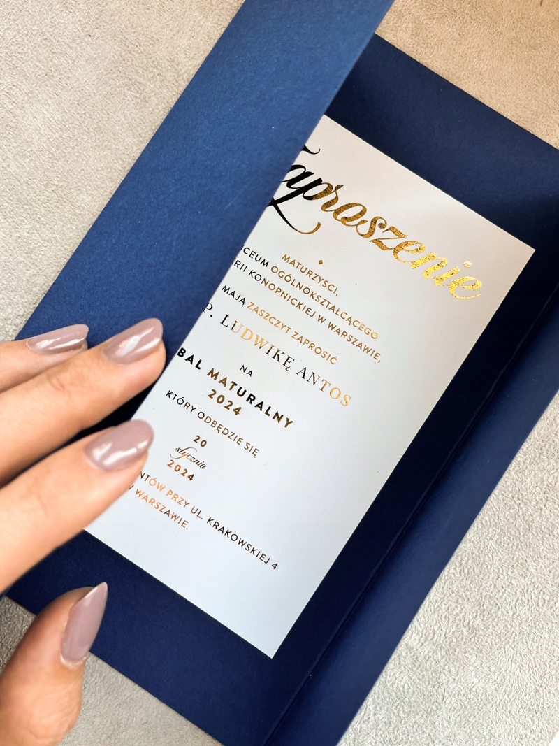 Розкішне золоте запрошення на випускний вечір. Елегантне позолочене запрошення на випускний бал середньої школи в красивій темно-синій обкладинці.