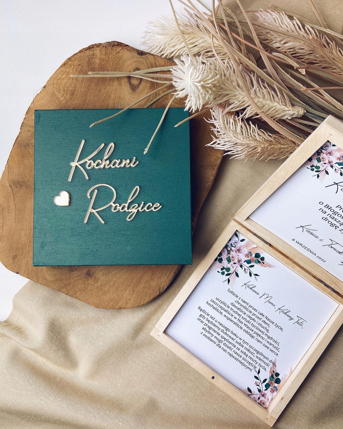 Унікальне прохання про благословення ваших батьків, поміщене в дерев'яну коробку, дозволить вам попросити їх у унікальний спосіб. У коробці дві картки зі зворушливим текстом, іменами нареченого та датою весілля, а також мінімалістичною та сучасною графікою з написом Dear Parents. Усе це виглядає фантастично та ідеально підходить.