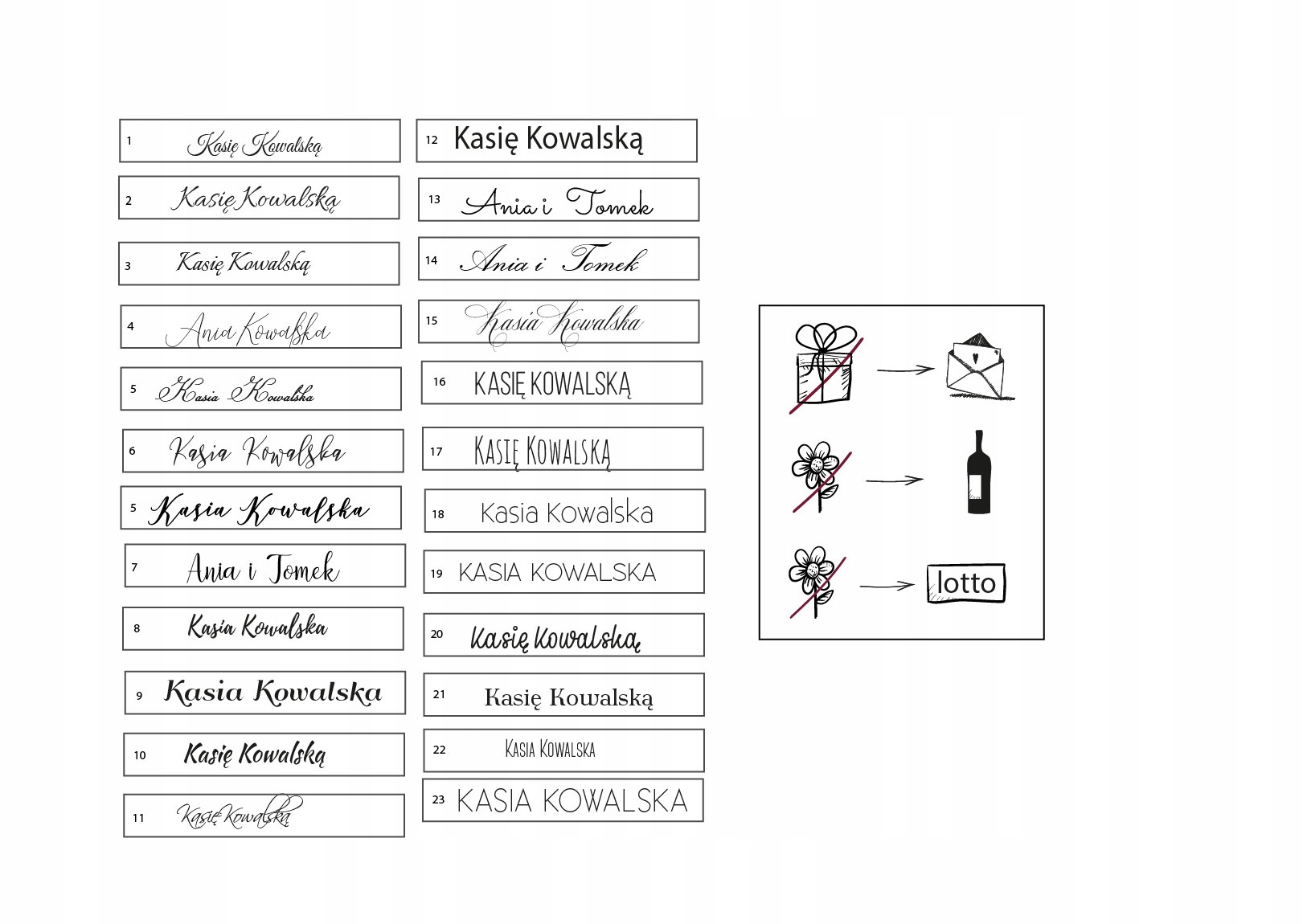 - список гостей у готовій до використання формі вставки, напр. Sz.P. Анна Ковальська, БЕЗ ДОДАТКОВИХ СИМВОЛІВ, тобто цифр, тире...