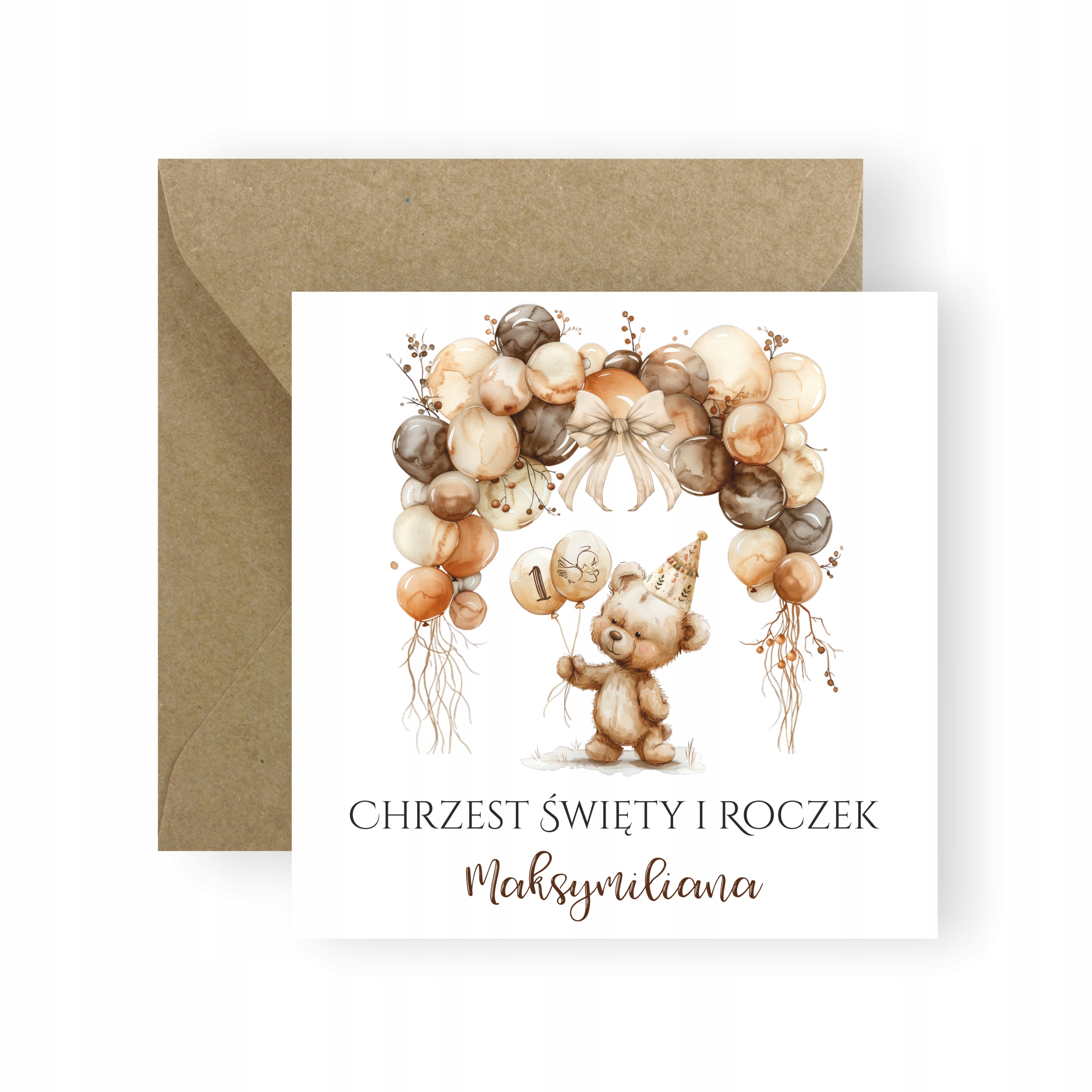 ZAPROSZENIA NA CHRZEST I ROCZEK + IMIĘ + KOPERTA BOHO MIŚ Z BALONIKAMI