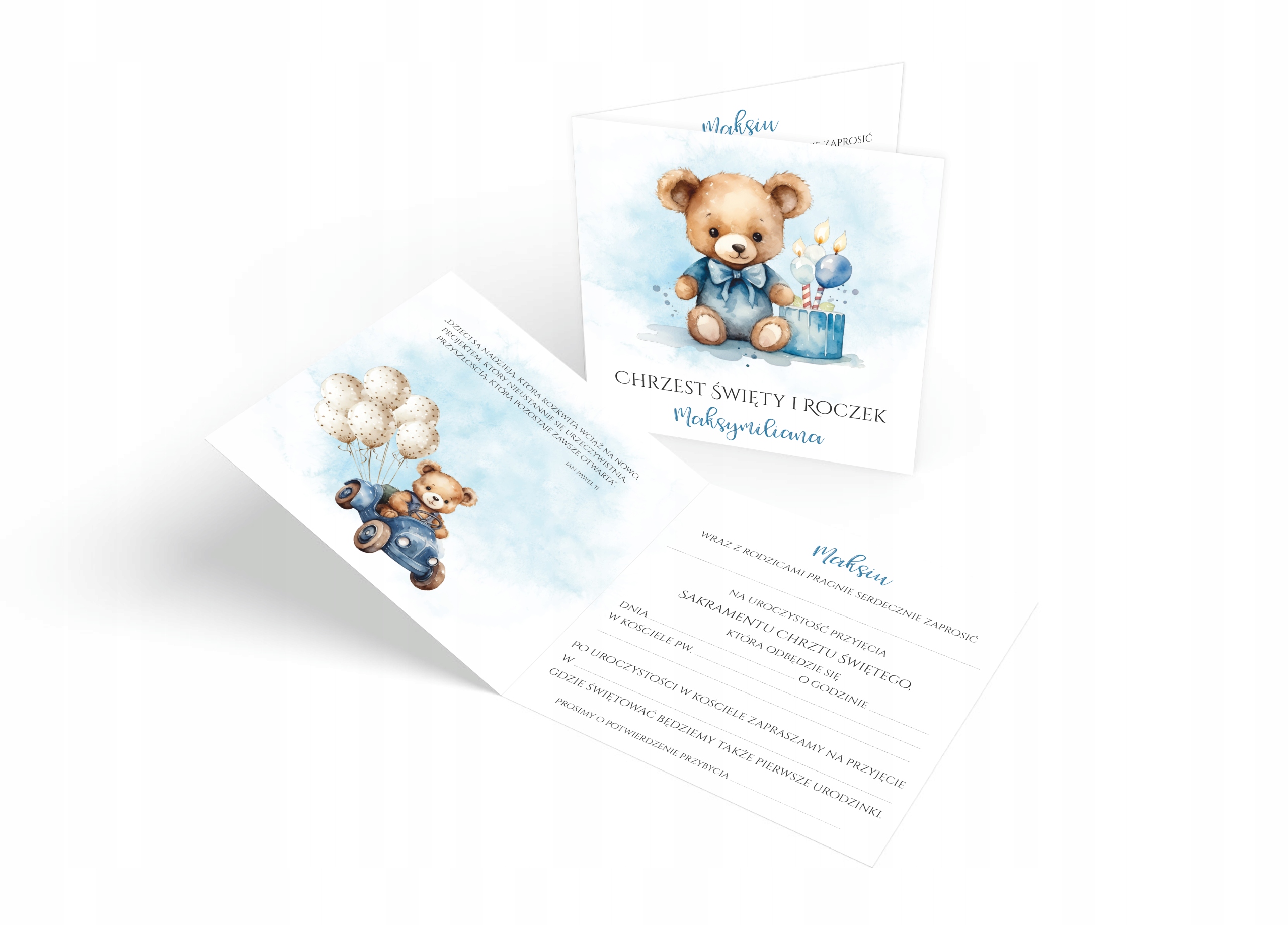 ZAPROSZENIA NA CHRZEST I ROCZEK + IMIĘ + KOPERTA BOHO MIŚ