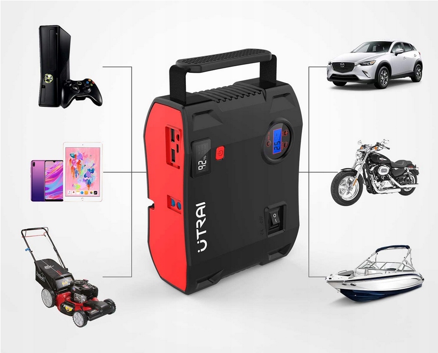UTRAI є багатофункціональним і може використовуватися не лише як пристрій для стрибків, але й як повітряний компресор, акумулятор живлення та світлодіодний ліхтарик.