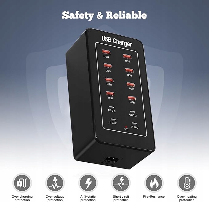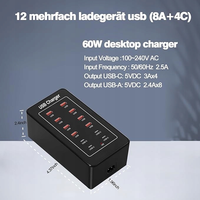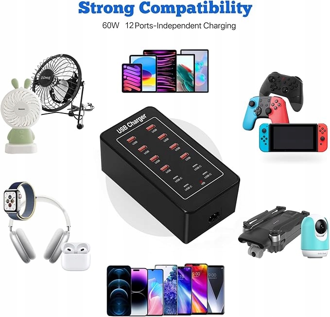 - Швидка станція зарядки USB - портативний USB -зарядний пристрій з 12 портами та загальною потужністю до 60 Вт (до 2,4 А для порту або 12 A загалом), 8 USB A+4 USB, завдяки якому ви можете заряджати кілька пристроїв одночасно (сумісні з майже всіма смартфонами, iPad, PowerBank, Electric Fan). Швидка та безпечна зарядка для задоволення потреб користувачів.