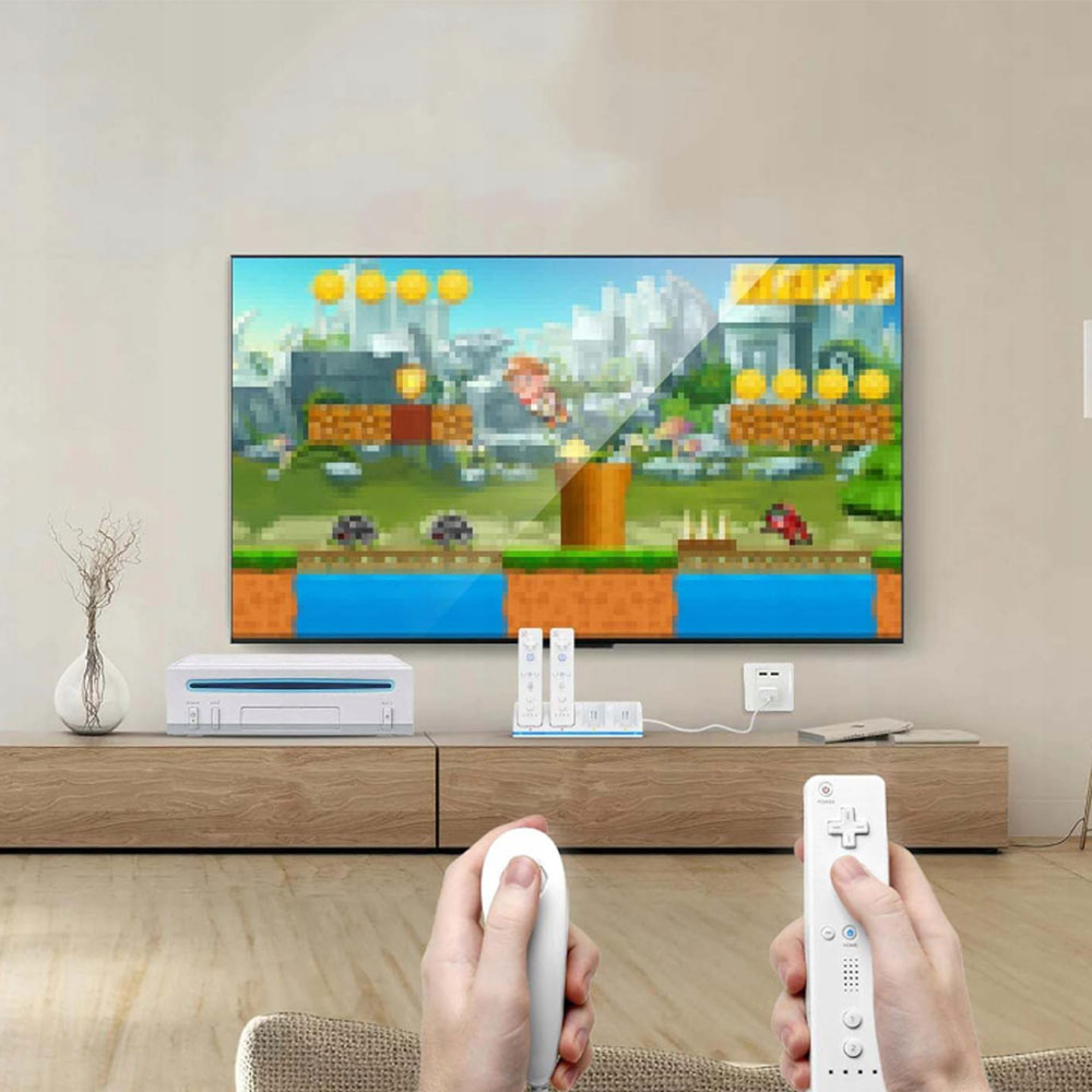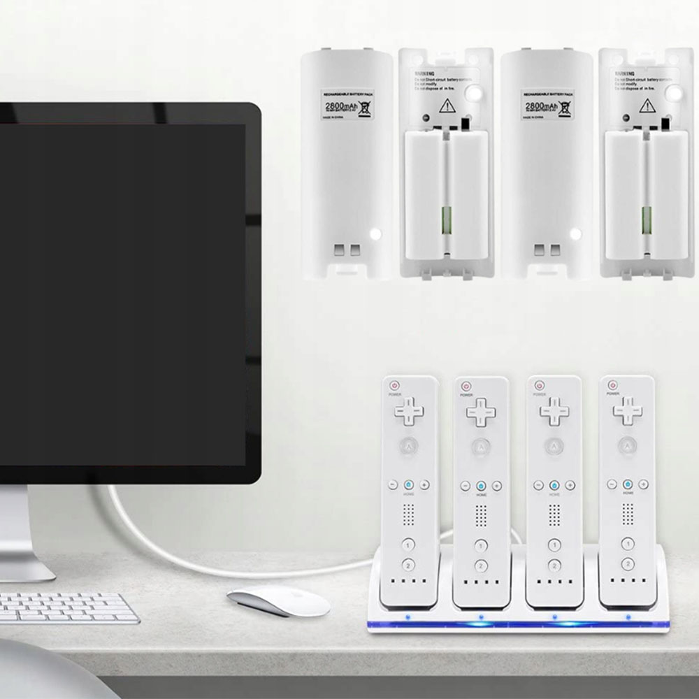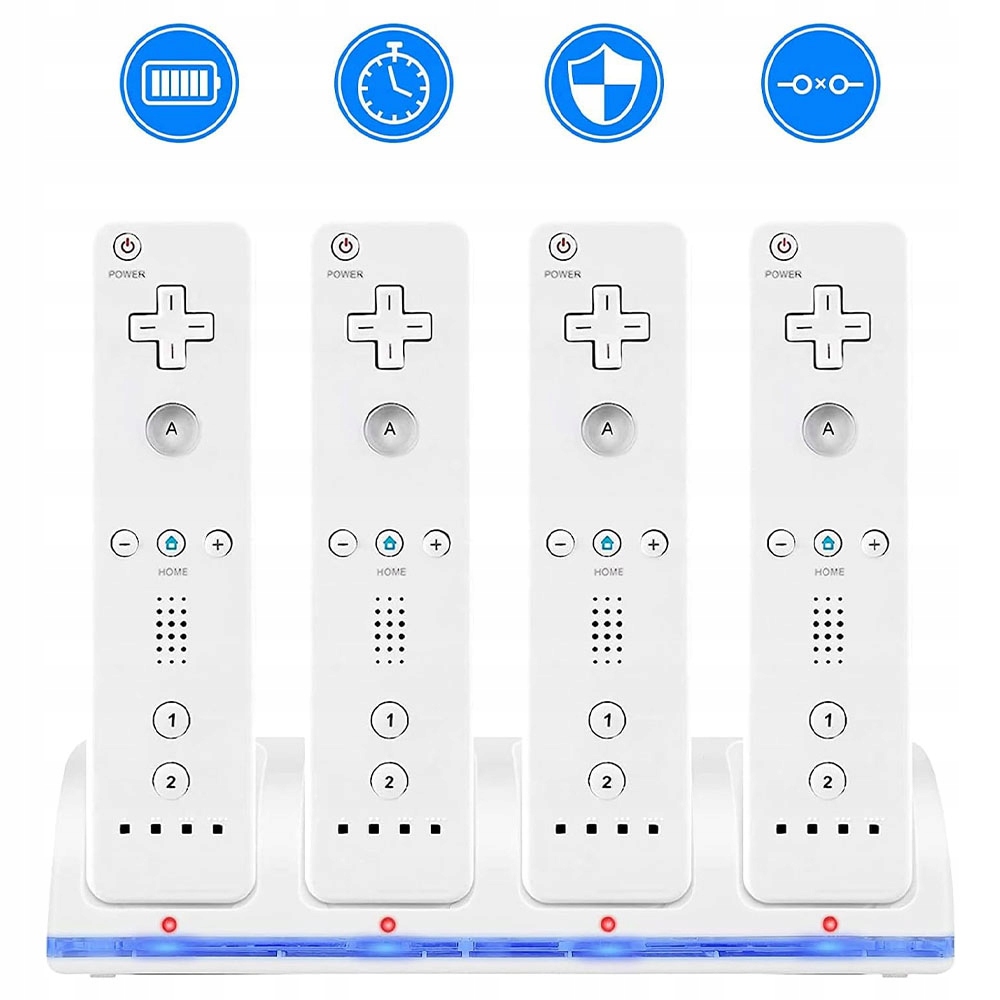 ✅4 порти зарядки - можливість одночасно заряджати чотири пілотів Wii/Wii U. Після правильного вставки та повернення перемикача пристрій пристрій починає завантажуватися, а функція повного заряду та скорочення захищає акумулятори від перевантаження.