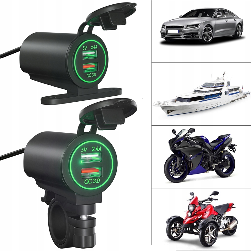 ЗАРЯДКА ДЛЯ МОТОЦИКЛА + КНОПКА + 2xUSB ЗЕЛЕНА СВІТЛО
