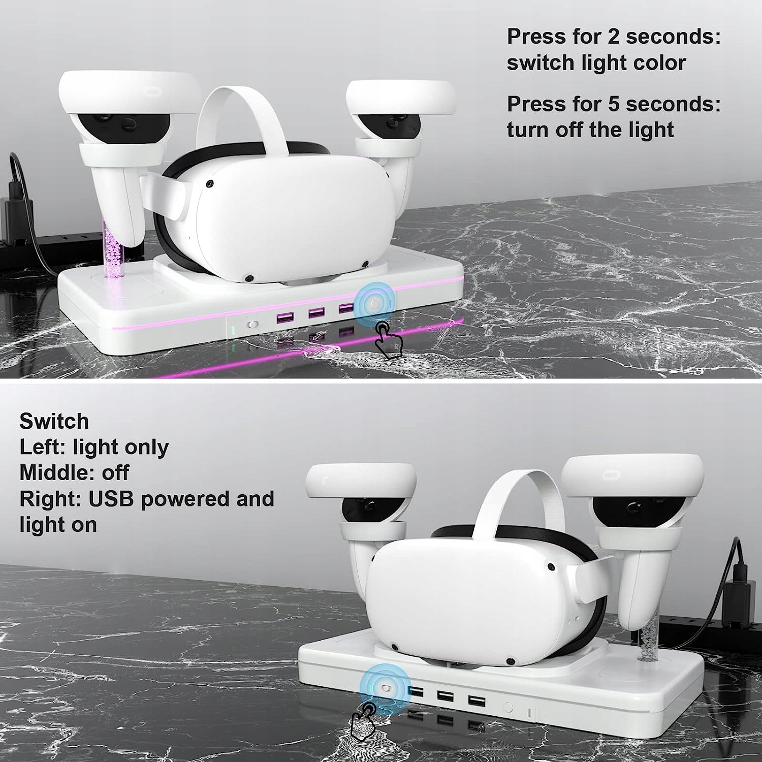 【Необхідні аксесуари для Quest 2】 Ця зарядна станція має 10 режимів і 7 кольорів. Кольорові дихаючі вогні створюють кращу ігрову атмосферу. Легко виберіть світло, яке вам найбільше подобається, натиснувши кнопку. Натисніть 2 секунди, щоб переключитися, натисніть 5 секунд, щоб вимкнути світло.