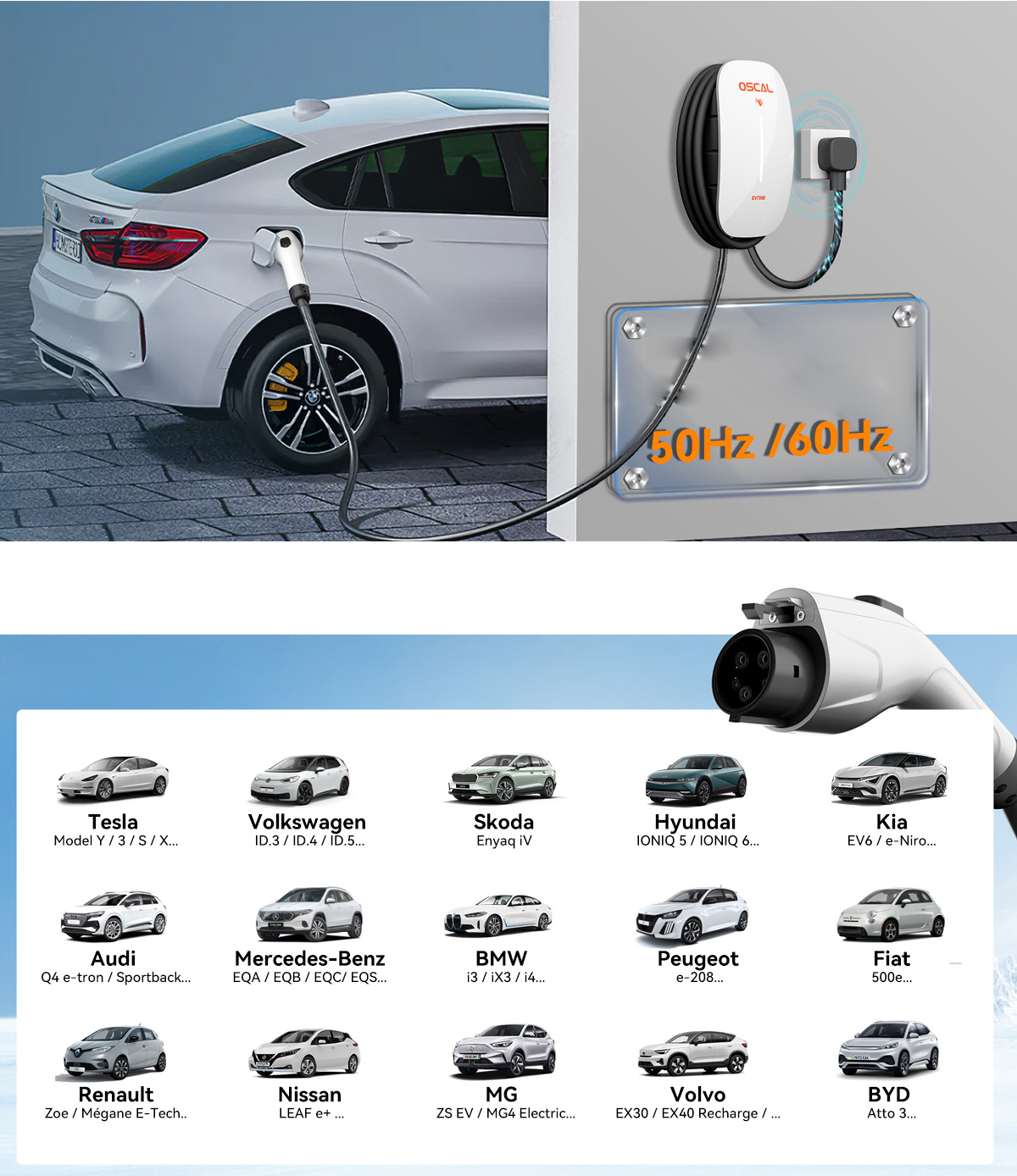 EV7000 сумісний із 99,9% електромобілів на ринку та підтримує стандарти IEC 62196 і SAE J1772. На додаток до власних мереж, таких як Tesla US, він охоплює майже всі поточні та майбутні електромобілі. (Підходить для всіх інших пристроїв, які використовують вхід типу 2. )