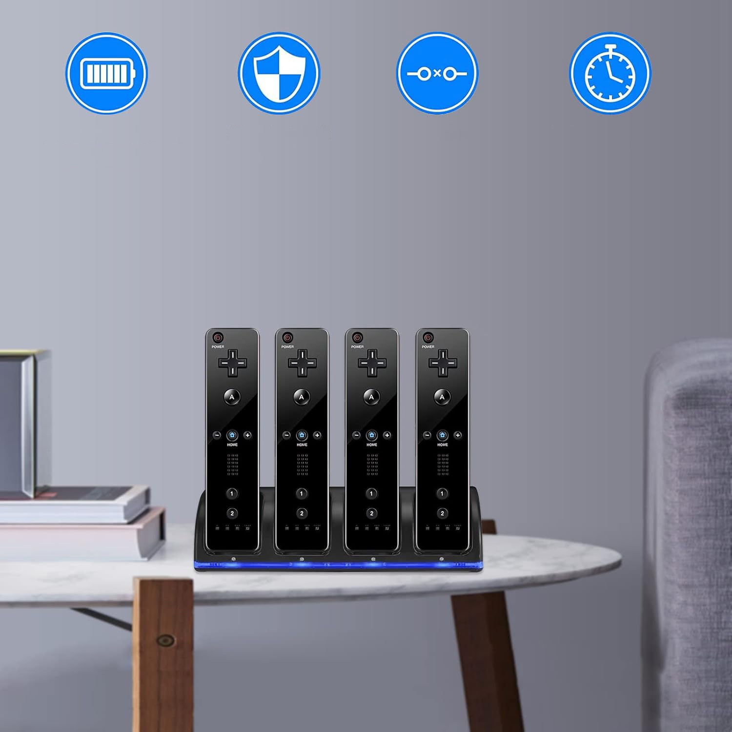 ⚡⚡4 зарядні станції: цей елемент сумісний із зарядним пристроєм контролера Wii. Зарядна станція має 4 порти зарядки, тому ви можете заряджати 4 контролери одночасно. Зарядна станція має 4 відповідні батареї, тож вам не доведеться турбуватися про проблеми з живленням.