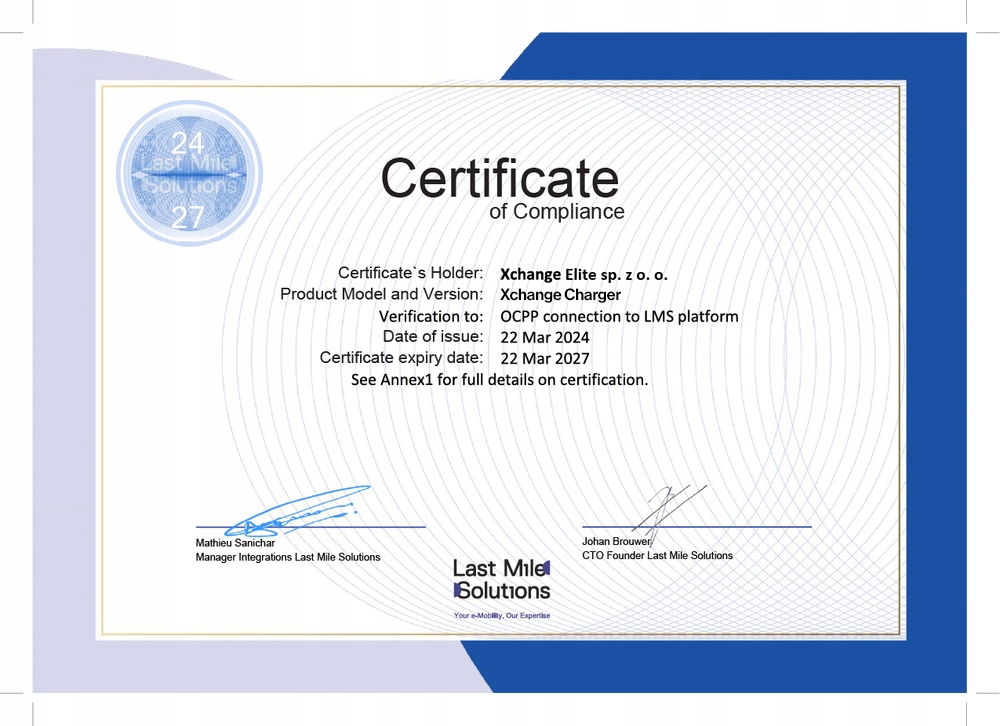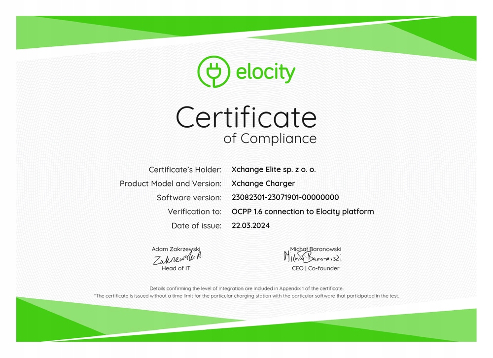 Отримання сертифікату відповідності від Elocity для зарядної станції Xchange Charger стало ключовим моментом у розвитку нашої компанії. Завдяки інтеграції зарядні станції Xchange видно по всій мережі Elocity! Вибір станції Xchange, оснащеної системою від відомої компанії Elocity, є свідомим і добре продуманим кроком для кожного, хто хоче інвестувати в майбутнє електромобільності.